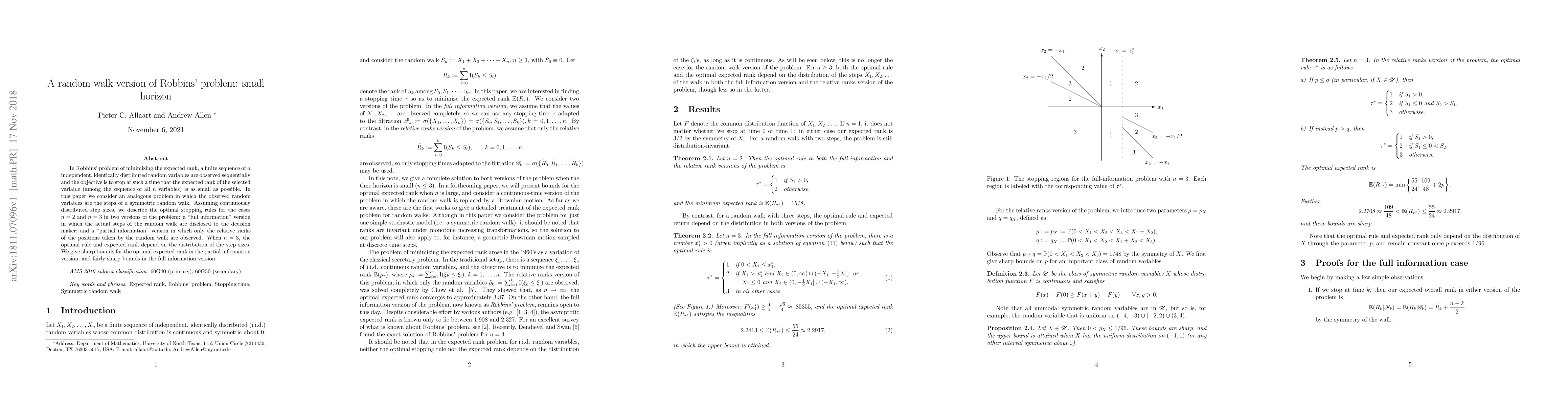 This paper addresses a variant of Robbins' problem, focusing on a random walk scenario with small horizon lengths (n=2,3). It details optimal stopping rules for both full and partial information versions, demonstrating that for n=3, the rules and expected ranks depend on step size distribution. The study provides sharp bounds for optimal expected ranks in partial information cases and fairly sharp ones in full information cases.