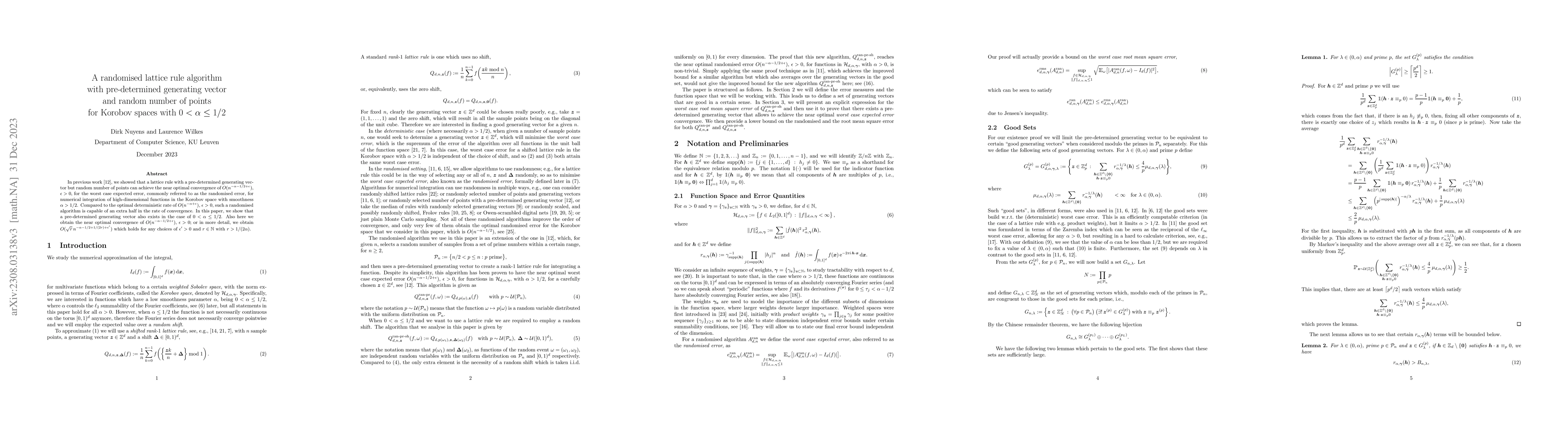 This paper extends previous work on lattice rules for high-dimensional numerical integration, demonstrating that a randomised lattice rule with a fixed generating vector and a random number of points can achieve near-optimal convergence of $O(n^{-\alpha-1/2+\epsilon})$ for $0 < \alpha \le 1/2$ in Korobov spaces, matching the optimal deterministic rate.