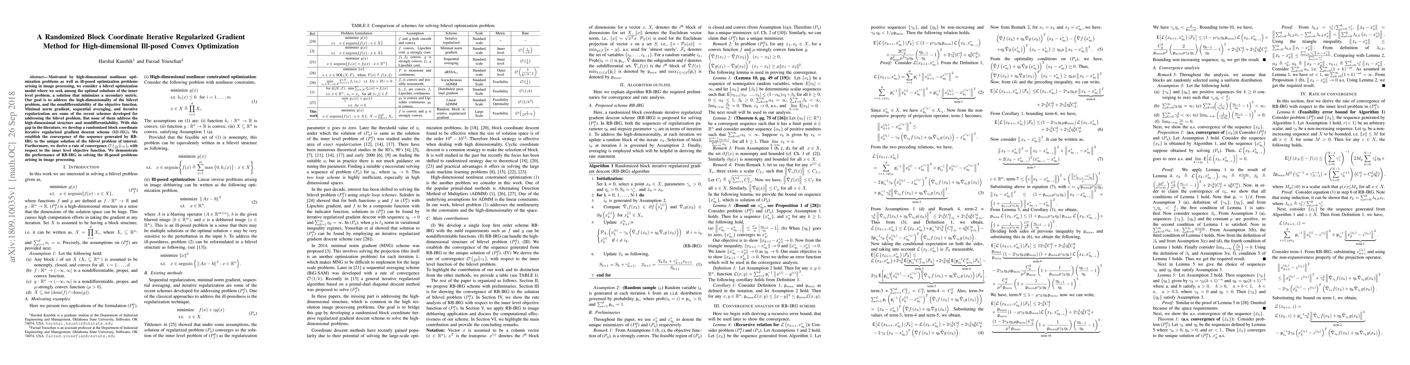 Motivated by high-dimensional nonlinear optimization problems as well as ill-posed optimization problems arising in image processing, we consider a bilevel optimization model where we seek among the optimal solutions of the inner level problem, a solution that minimizes a secondary metric. Our goal is to address the high-dimensionality of the bilevel problem, and the nondifferentiability of the objective function. Minimal norm gradient, sequential averaging, and iterative regularization are some of the recent schemes developed for addressing the bilevel problem. But none of them address the high-dimensional structure and nondifferentiability. With this gap in the literature, we develop a randomized block coordinate iterative regularized gradient descent scheme (RB-IRG). We establish the convergence of the sequence generated by RB-IRG to the unique solution of the bilevel problem of interest. Furthermore, we derive a rate of convergence $\mathcal{O} \left(\frac{1}{{k}^{0.5-\delta}}\right)$, with respect to the inner level objective function. We demonstrate the performance of RB-IRG in solving the ill-posed problems arising in image processing.