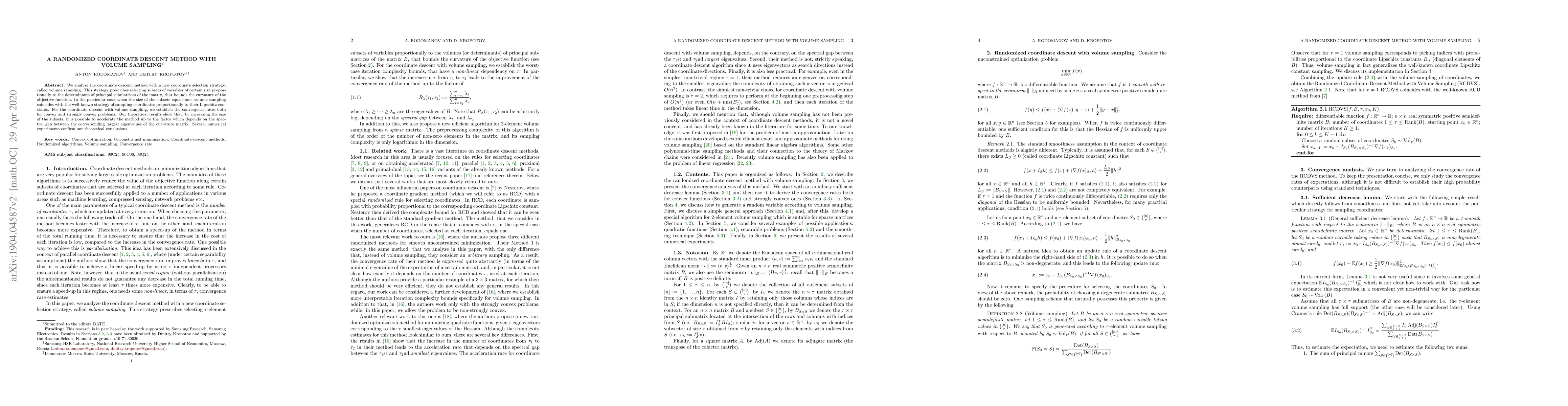 This paper introduces a randomized coordinate descent method using volume sampling, where coordinates are selected based on the determinants of principal submatrices. Theoretical analysis shows improved convergence rates for both convex and strongly convex problems, with acceleration depending on the spectral gap of the curvature matrix, and numerical experiments validate these findings.
