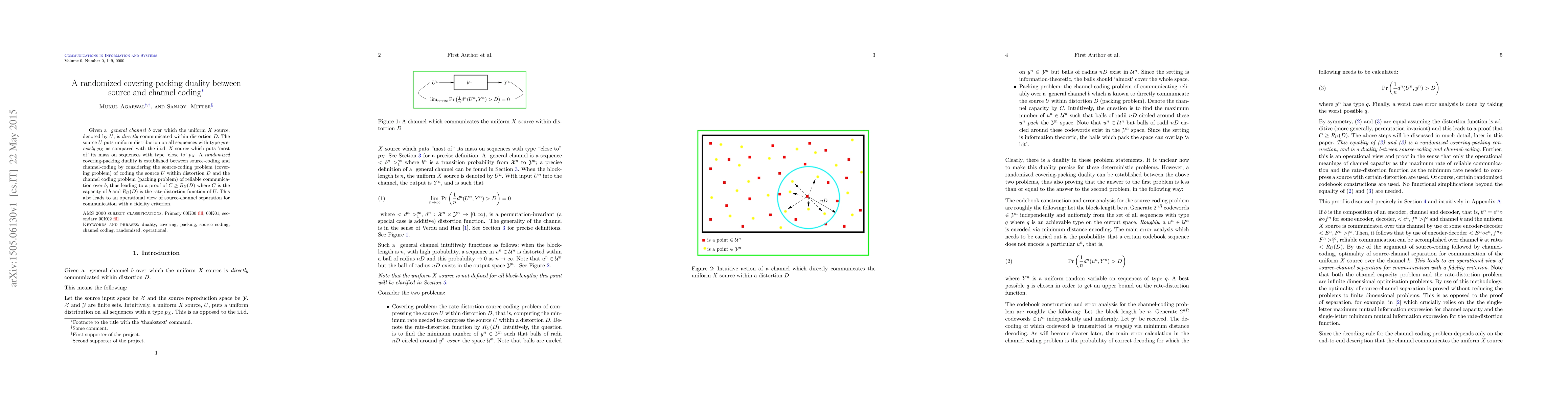 Summary: This paper explores a randomized covering-packing duality linking source and channel coding, focusing on the source coding problem and channel communication within a specified distortion level, and briefly discusses the operational view of source-channel separation under fidelity criteria.