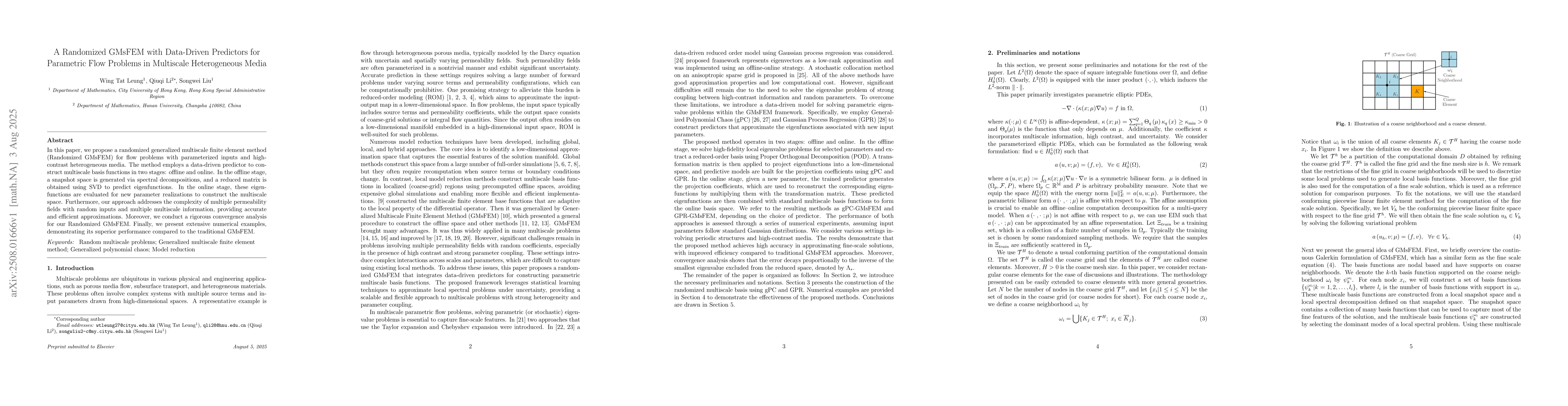 In this paper, we propose a randomized generalized multiscale finite element method (Randomized GMsFEM) for flow problems with parameterized inputs and high-contrast heterogeneous media. The method employs a data-driven predictor to construct multiscale basis functions in two stages: offline and online. In the offline stage, a snapshot space is generated via spectral decompositions, and a reduced matrix is obtained using SVD to predict eigenfunctions. In the online stage, these eigenfunctions are evaluated for new parameter realizations to construct the multiscale space. Furthermore, our approach addresses the complexity of multiple permeability fields with random inputs and multiple multiscale information, providing accurate and efficient approximations. Moreover, we conduct a rigorous convergence analysis for our Randomized GMsFEM. Finally, we present extensive numerical examples, demonstrating its superior performance compared to the traditional GMsFEM.