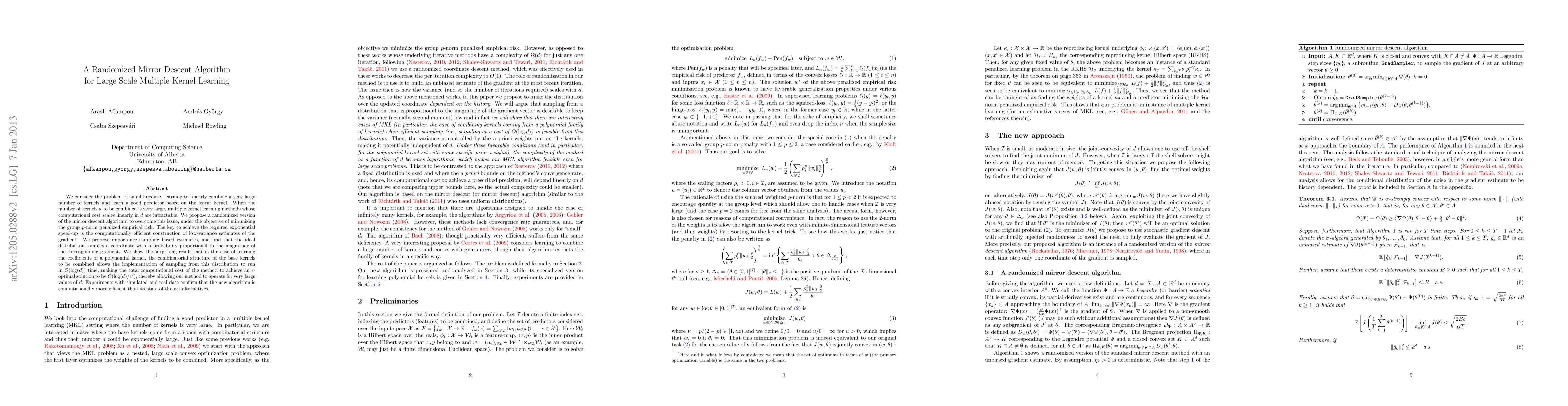 We consider the problem of simultaneously learning to linearly combine a very large number of kernels and learn a good predictor based on the learnt kernel. When the number of kernels $d$ to be combined is very large, multiple kernel learning methods whose computational cost scales linearly in $d$ are intractable. We propose a randomized version of the mirror descent algorithm to overcome this issue, under the objective of minimizing the group $p$-norm penalized empirical risk. The key to achieve the required exponential speed-up is the computationally efficient construction of low-variance estimates of the gradient. We propose importance sampling based estimates, and find that the ideal distribution samples a coordinate with a probability proportional to the magnitude of the corresponding gradient. We show the surprising result that in the case of learning the coefficients of a polynomial kernel, the combinatorial structure of the base kernels to be combined allows the implementation of sampling from this distribution to run in $O(\log(d))$ time, making the total computational cost of the method to achieve an $\epsilon$-optimal solution to be $O(\log(d)/\epsilon^2)$, thereby allowing our method to operate for very large values of $d$. Experiments with simulated and real data confirm that the new algorithm is computationally more efficient than its state-of-the-art alternatives.