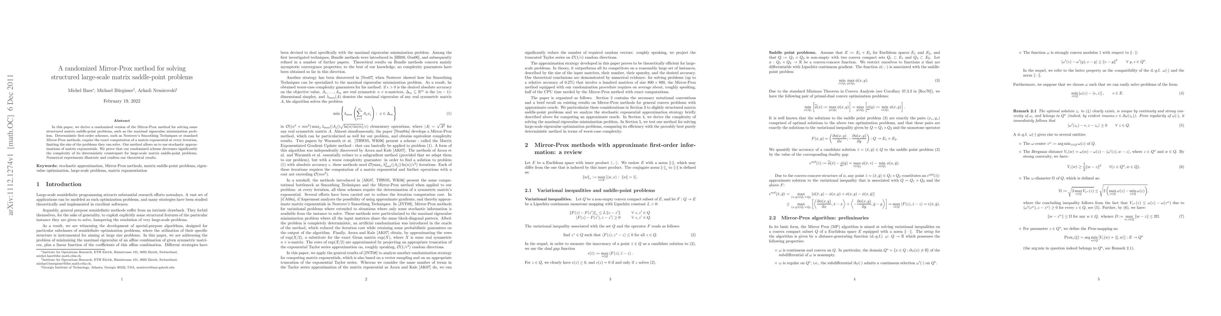 This paper introduces a randomized version of the Mirror-Prox method to efficiently solve large-scale matrix saddle-point problems, using stochastic approximations of matrix exponentials. The proposed method significantly reduces computational complexity compared to deterministic approaches, as demonstrated by theoretical analysis and numerical experiments.