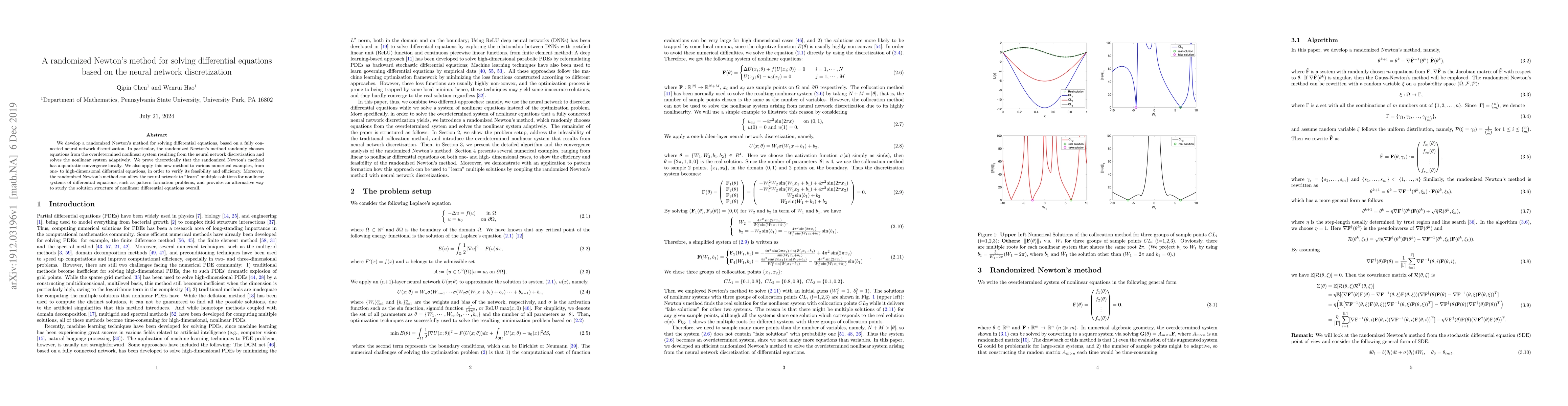 We develop a randomized Newton's method for solving differential equations, based on a fully connected neural network discretization. In particular, the randomized Newton's method randomly chooses equations from the overdetermined nonlinear system resulting from the neural network discretization and solves the nonlinear system adaptively. We prove theoretically that the randomized Newton's method has a quadratic convergence locally. We also apply this new method to various numerical examples, from one- to high-dimensional differential equations, in order to verify its feasibility and efficiency. Moreover, the randomized Newton's method can allow the neural network to "learn" multiple solutions for nonlinear systems of differential equations, such as pattern formation problems, and provides an alternative way to study the solution structure of nonlinear differential equations overall.