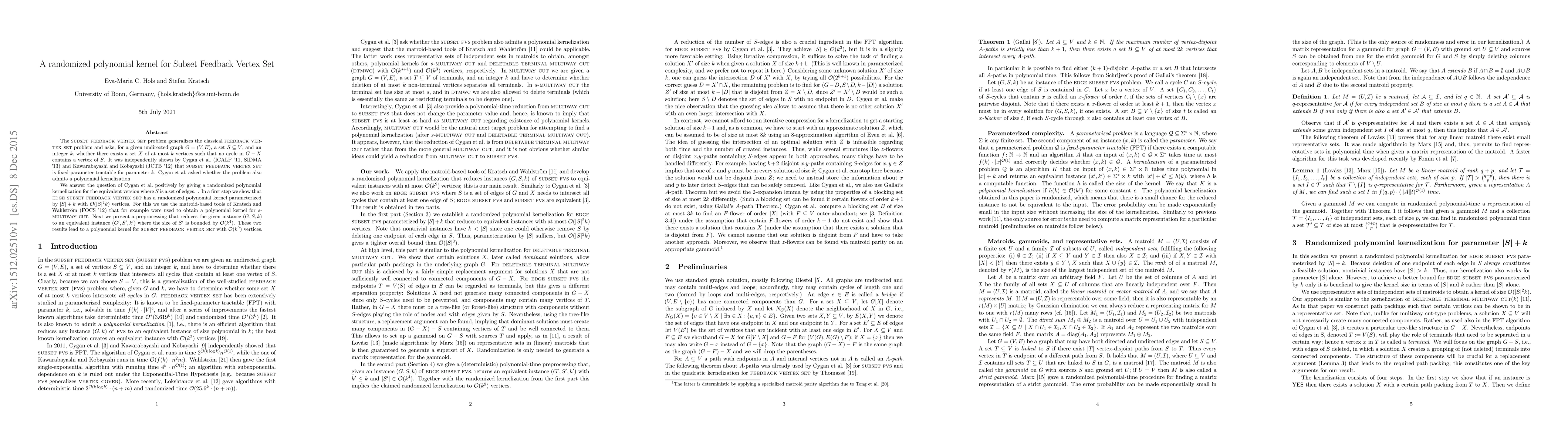 The Subset Feedback Vertex Set problem generalizes the classical Feedback Vertex Set problem and asks, for a given undirected graph $G=(V,E)$, a set $S \subseteq V$, and an integer $k$, whether there exists a set $X$ of at most $k$ vertices such that no cycle in $G-X$ contains a vertex of $S$. It was independently shown by Cygan et al. (ICALP '11, SIDMA '13) and Kawarabayashi and Kobayashi (JCTB '12) that Subset Feedback Vertex Set is fixed-parameter tractable for parameter $k$. Cygan et al. asked whether the problem also admits a polynomial kernelization. We answer the question of Cygan et al. positively by giving a randomized polynomial kernelization for the equivalent version where $S$ is a set of edges. In a first step we show that Edge Subset Feedback Vertex Set has a randomized polynomial kernel parameterized by $|S|+k$ with $O(|S|^2k)$ vertices. For this we use the matroid-based tools of Kratsch and Wahlstr\"om (FOCS '12) that for example were used to obtain a polynomial kernel for $s$-Multiway Cut. Next we present a preprocessing that reduces the given instance $(G,S,k)$ to an equivalent instance $(G',S',k')$ where the size of $S'$ is bounded by $O(k^4)$. These two results lead to a polynomial kernel for Subset Feedback Vertex Set with $O(k^9)$ vertices.