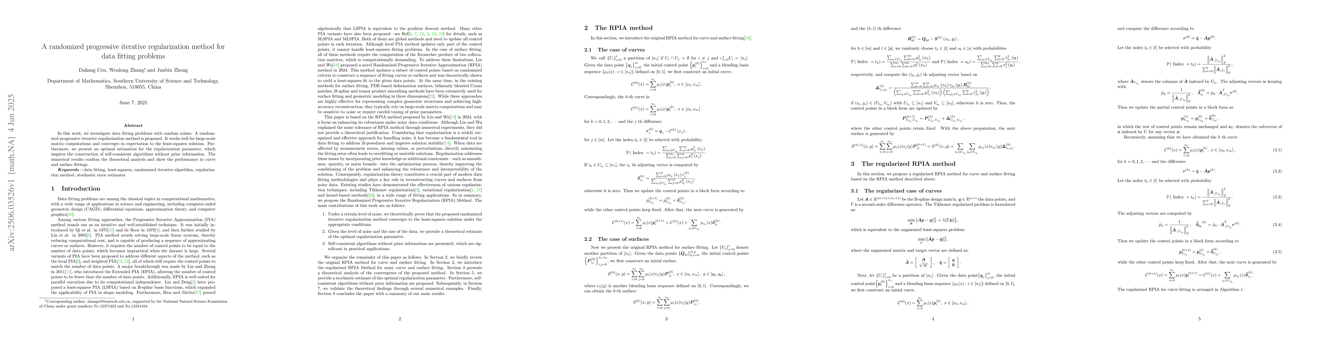 In this work, we investigate data fitting problems with random noises. A randomized progressive iterative regularization method is proposed. It works well for large-scale matrix computations and converges in expectation to the least-squares solution. Furthermore, we present an optimal estimation for the regularization parameter, which inspires the construction of self-consistent algorithms without prior information. The numerical results confirm the theoretical analysis and show the performance in curve and surface fittings.