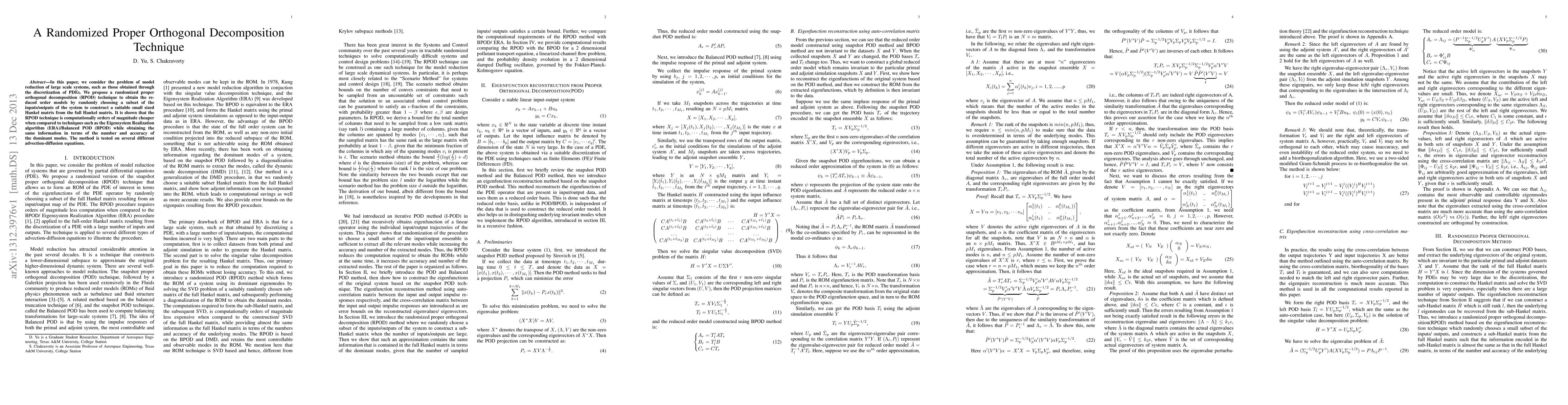 This paper introduces a randomized proper orthogonal decomposition (RPOD) technique for model reduction of large systems, demonstrating significant computational savings compared to traditional methods like ERA/BPOD while maintaining accuracy. The method is validated through its application to various advection-diffusion equations.
