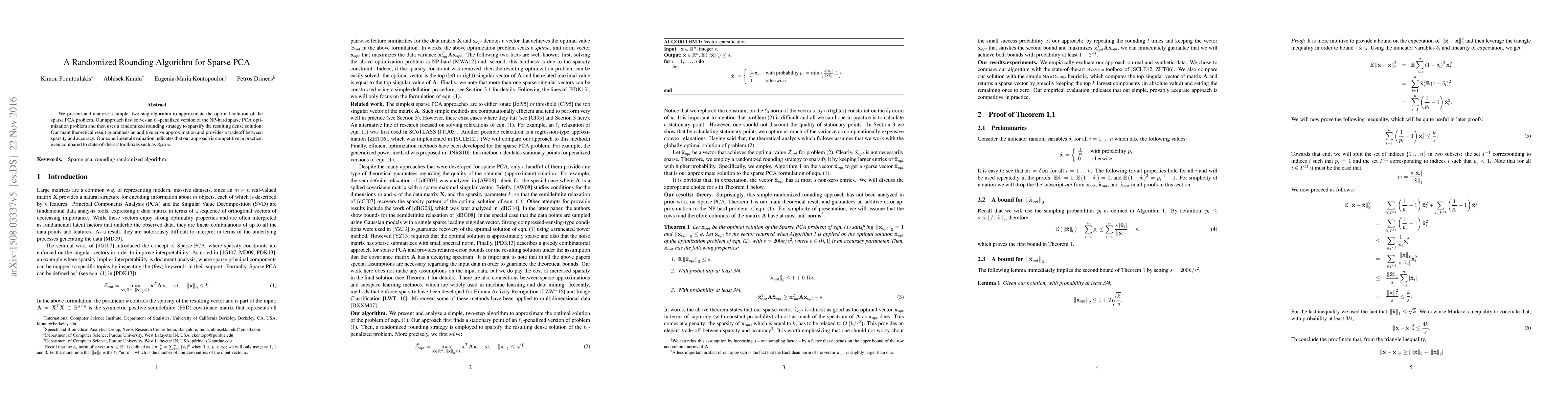 This paper introduces a two-step algorithm for approximating sparse PCA, solving a L1 penalized version first, followed by randomized rounding to achieve sparsity. Theoretical analysis guarantees additive error and a balance between sparsity and accuracy, with experimental results showing competitive performance against existing methods.