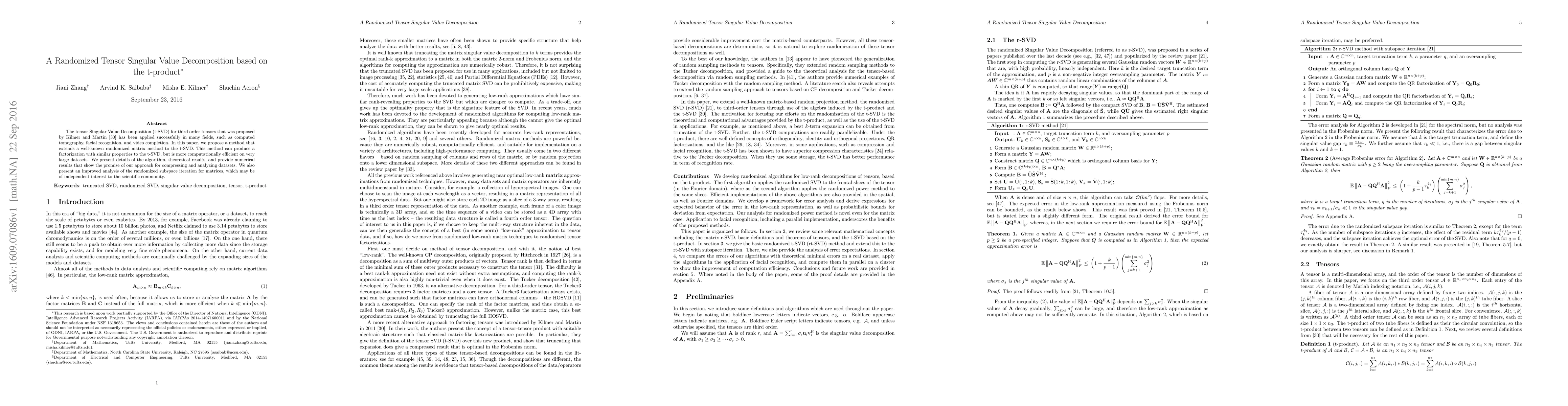 This paper introduces a randomized tensor Singular Value Decomposition (t-SVD) method based on the t-product, offering a more computationally efficient alternative for large datasets. The proposed algorithm is demonstrated to effectively compress and analyze data, with applications in areas like computed tomography and video completion.