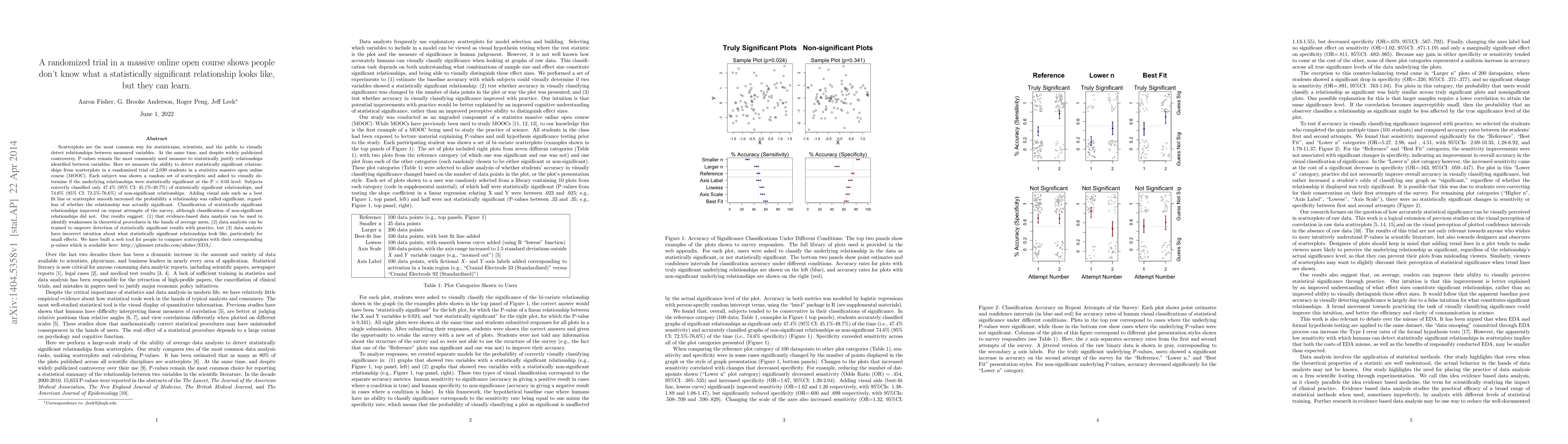 Scatterplots are the most common way for statisticians, scientists, and the public to visually detect relationships between measured variables. At the same time, and despite widely publicized controversy, P-values remain the most commonly used measure to statistically justify relationships identified between variables. Here we measure the ability to detect statistically significant relationships from scatterplots in a randomized trial of 2,039 students in a statistics massive open online course (MOOC). Each subject was shown a random set of scatterplots and asked to visually determine if the underlying relationships were statistically significant at the P < 0.05 level. Subjects correctly classified only 47.4% (95% CI: 45.1%-49.7%) of statistically significant relationships, and 74.6% (95% CI: 72.5%-76.6%) of non-significant relationships. Adding visual aids such as a best fit line or scatterplot smooth increased the probability a relationship was called significant, regardless of whether the relationship was actually significant. Classification of statistically significant relationships improved on repeat attempts of the survey, although classification of non-significant relationships did not. Our results suggest: (1) that evidence-based data analysis can be used to identify weaknesses in theoretical procedures in the hands of average users, (2) data analysts can be trained to improve detection of statistically significant results with practice, but (3) data analysts have incorrect intuition about what statistically significant relationships look like, particularly for small effects. We have built a web tool for people to compare scatterplots with their corresponding p-values which is available here: http://glimmer.rstudio.com/afisher/EDA/.