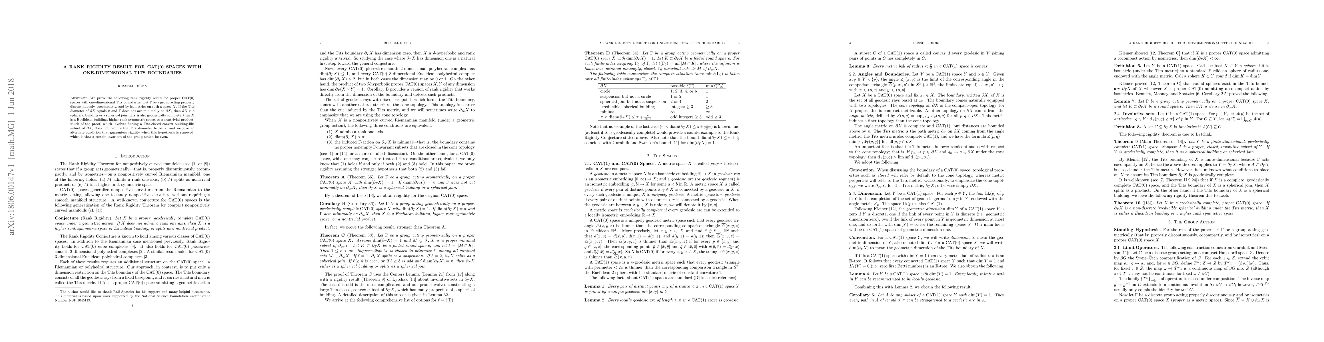Summary: The paper establishes a rank rigidity result for proper CAT(0) spaces with one-dimensional Tits boundaries, proving that under specific conditions, the boundary is either a spherical building or a spherical join, and the space itself is a Euclidean building, higher rank symmetric space, or a nontrivial product. The proof involves identifying a Tits-closed convex subset and provides an alternate condition for rigidity when the Tits diameter is not $\pi$.