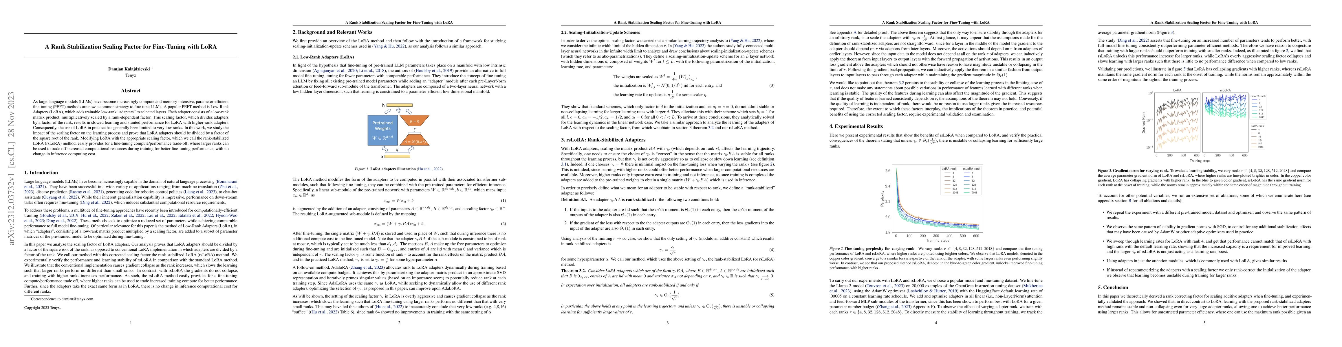 This paper proposes a rank stabilization scaling factor for Low-Rank Adapters (LoRA) to improve parameter-efficient fine-tuning of large language models. The authors demonstrate that dividing LoRA adapters by the square root of the rank enhances learning and performance, introducing the rank-stabilized LoRA (rsLoRA) method for better trade-offs between training compute and fine-tuning performance.