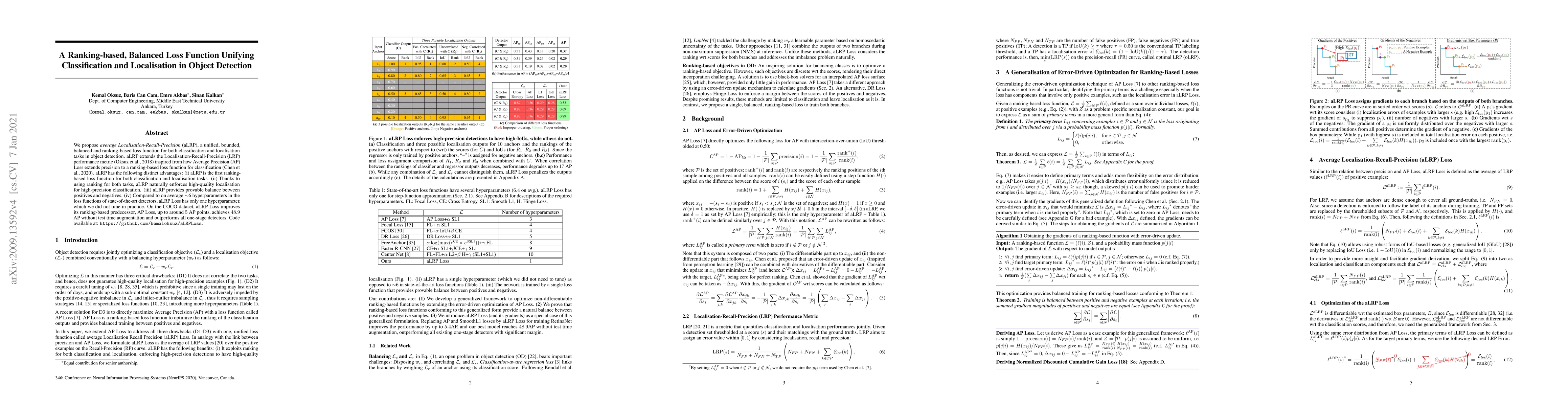 This paper proposes aLRP, a unified ranking-based loss function that balances classification and localization in object detection. It outperforms existing methods with fewer hyperparameters and achieves better performance on the COCO dataset.