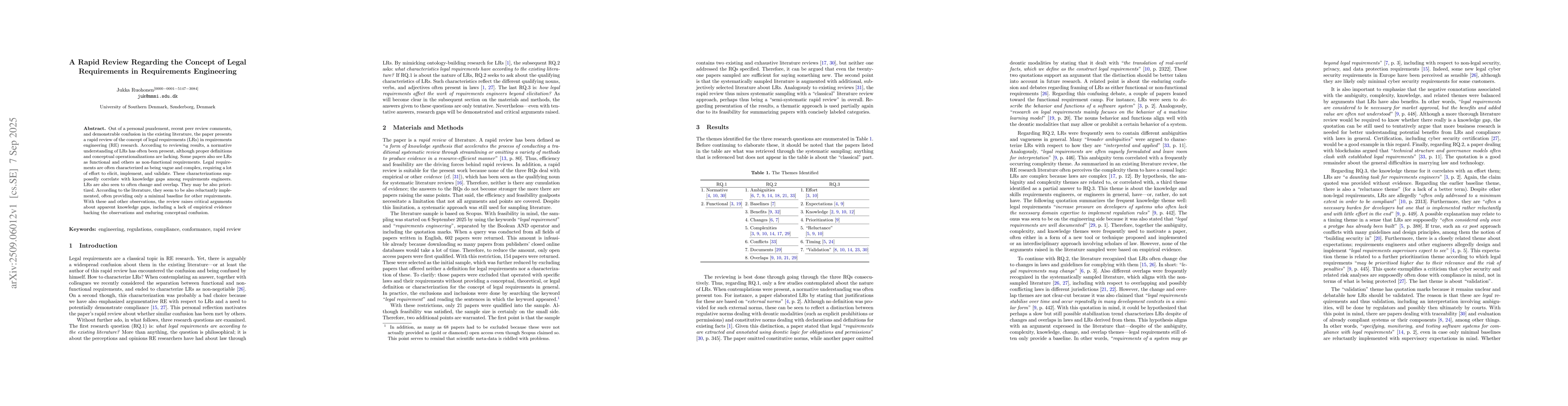 Out of a personal puzzlement, recent peer review comments, and demonstrable confusion in the existing literature, the paper presents a rapid review of the concept of legal requirements (LRs) in requirements engineering (RE) research. According to reviewing results, a normative understanding of LRs has often been present, although proper definitions and conceptual operationalizations are lacking. Some papers also see LRs as functional and others as non-functional requirements. Legal requirements are often characterized as being vague and complex, requiring a lot of effort to elicit, implement, and validate. These characterizations supposedly correlate with knowledge gaps among requirements engineers. LRs are also seen to often change and overlap. They may be also prioritized. According to the literature, they seem to be also reluctantly implemented, often providing only a minimal baseline for other requirements. With these and other observations, the review raises critical arguments about apparent knowledge gaps, including a lack of empirical evidence backing the observations and enduring conceptual confusion.
