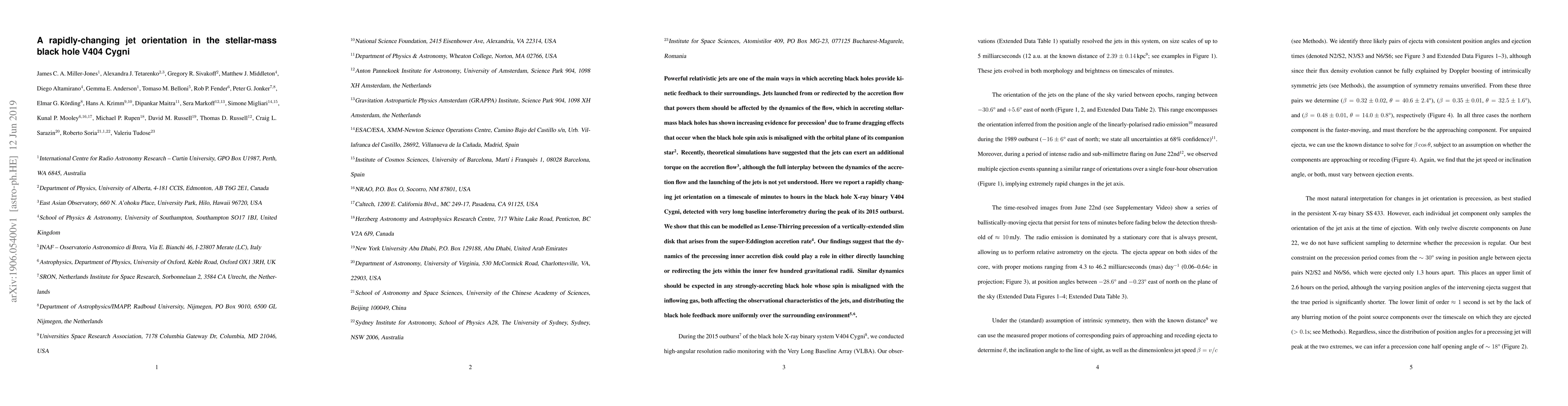 A rapidly changing jet orientation in V404 Cygni is modelled as Lense-Thirring precession of a disk, suggesting the inner accretion disk launches or redirects jets through dynamics.