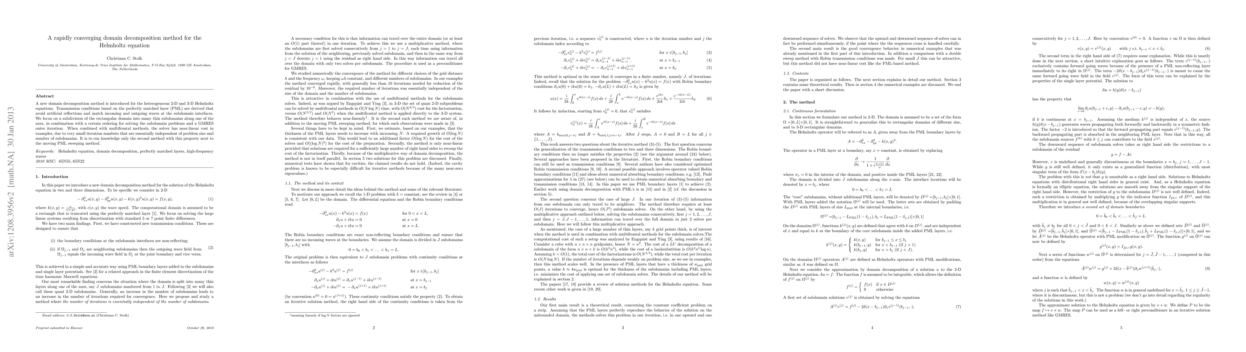 This paper introduces a novel domain decomposition method for solving the 2-D and 3-D Helmholtz equations, utilizing perfectly matched layers to prevent reflections and employing a GMRES iteration with a specific subdomain ordering. The method achieves near-linear computational cost due to minimal iteration counts, making it one of the few with such efficiency.