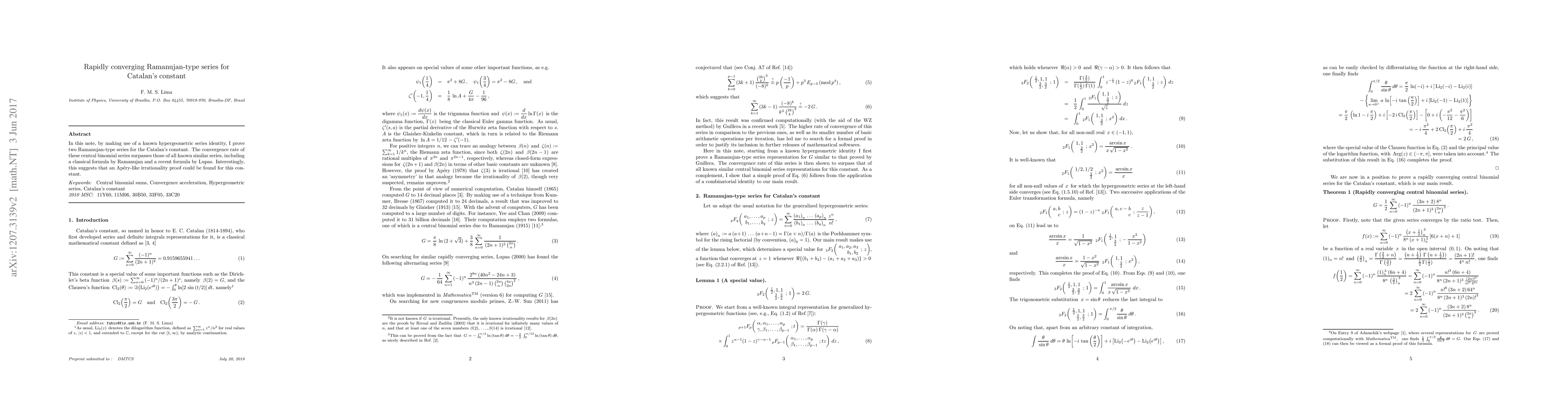 This paper proves two new Ramanujan-type series for Catalan's constant with faster convergence rates than existing formulas, suggesting an Apéry-like irrationality proof could be found for this constant.