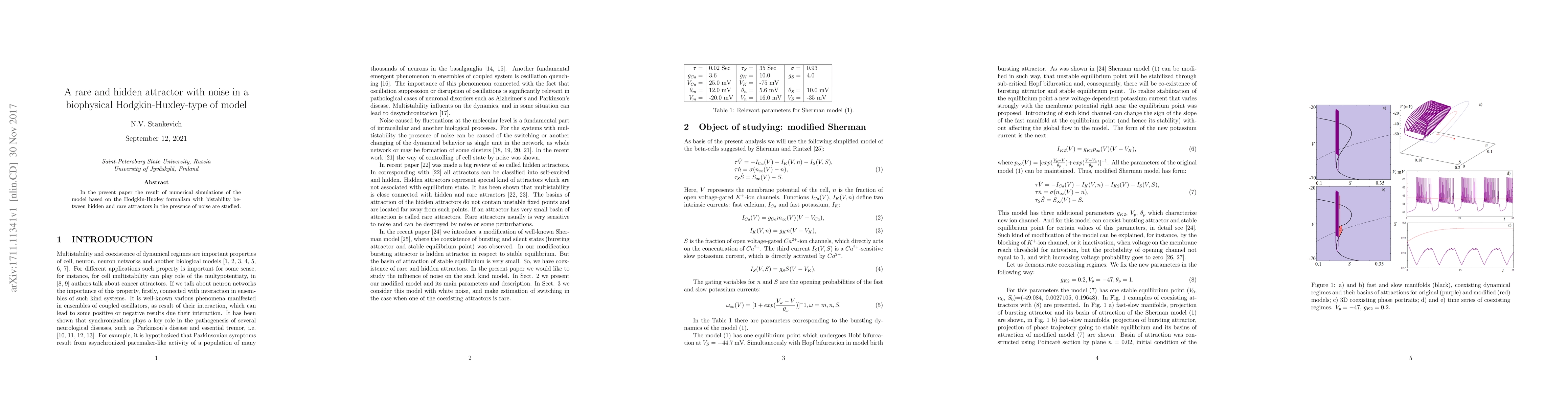 This paper investigates numerical simulations of a Hodgkin-Huxley-type model demonstrating bistability between hidden and rare attractors under the influence of noise. The study reveals complex dynamical behaviors in biophysical models.