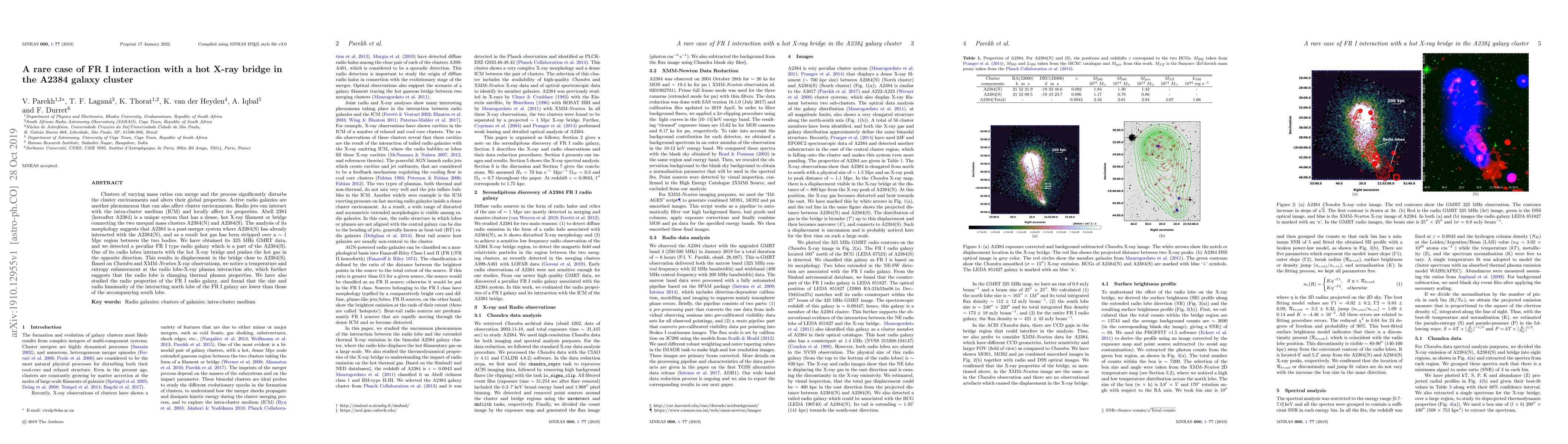 The research paper presents a rare case of a FR I radio galaxy in the A2384 cluster interacting with a hot X-ray bridge, causing displacement and altering thermal plasma properties. The study combines GMRT radio data, Chandra, and XMM-Newton X-ray observations to reveal unique interactions between radio lobes and hot gas.