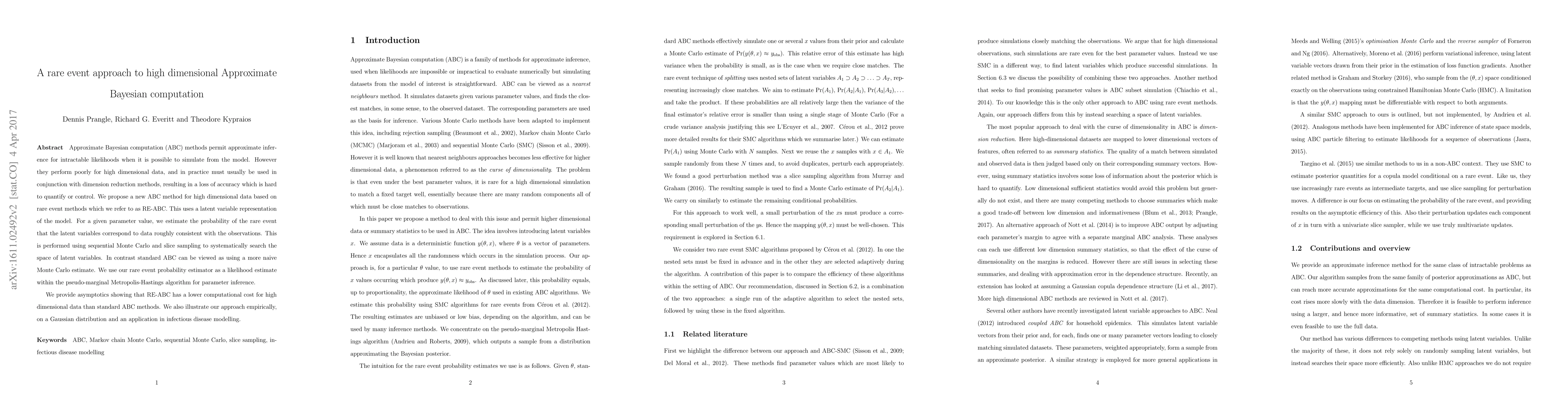 This paper introduces RE-ABC, a novel Approximate Bayesian Computation method for high dimensional data, leveraging rare event probability estimation via sequential Monte Carlo and slice sampling. Unlike standard ABC, RE-ABC uses a latent variable representation to improve accuracy and reduce computational costs, demonstrated through Gaussian distribution and infectious disease modeling applications.