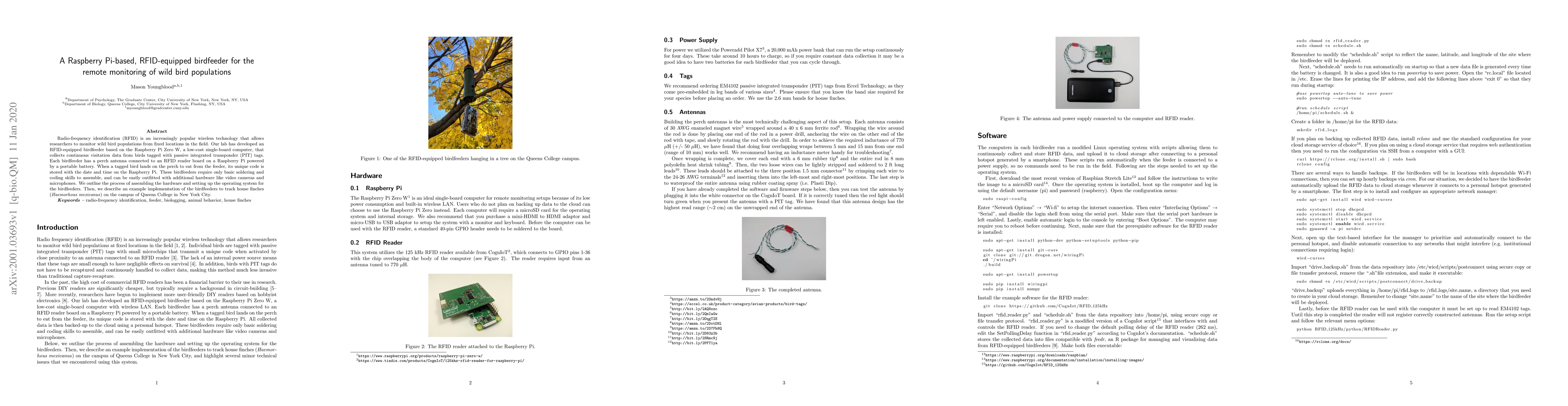 This paper details a low-cost, Raspberry Pi-based RFID birdfeeder system for monitoring wild bird populations, specifically house finches, using passive integrated transponder tags. The setup allows for continuous data collection on bird visitations and can be expanded with additional sensors.