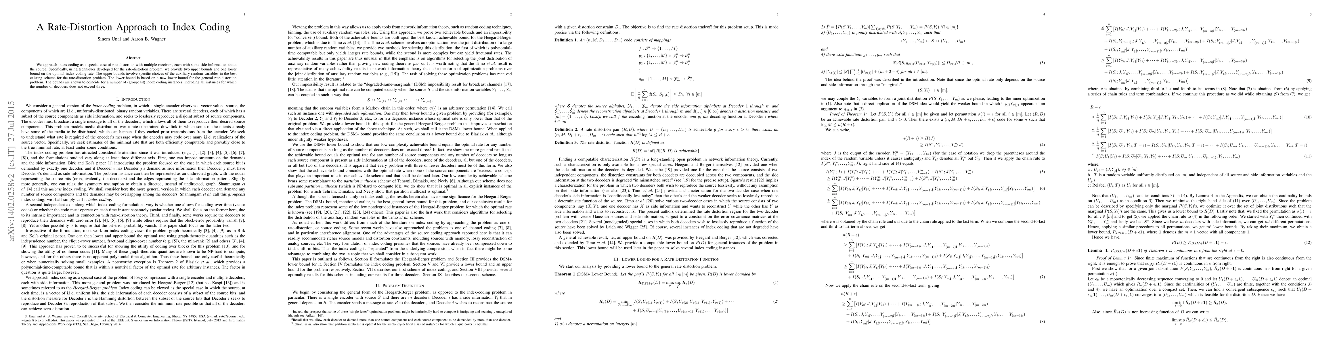 The paper presents a rate-distortion approach to index coding, leveraging techniques from the rate-distortion problem to derive upper and lower bounds on the optimal index coding rate.