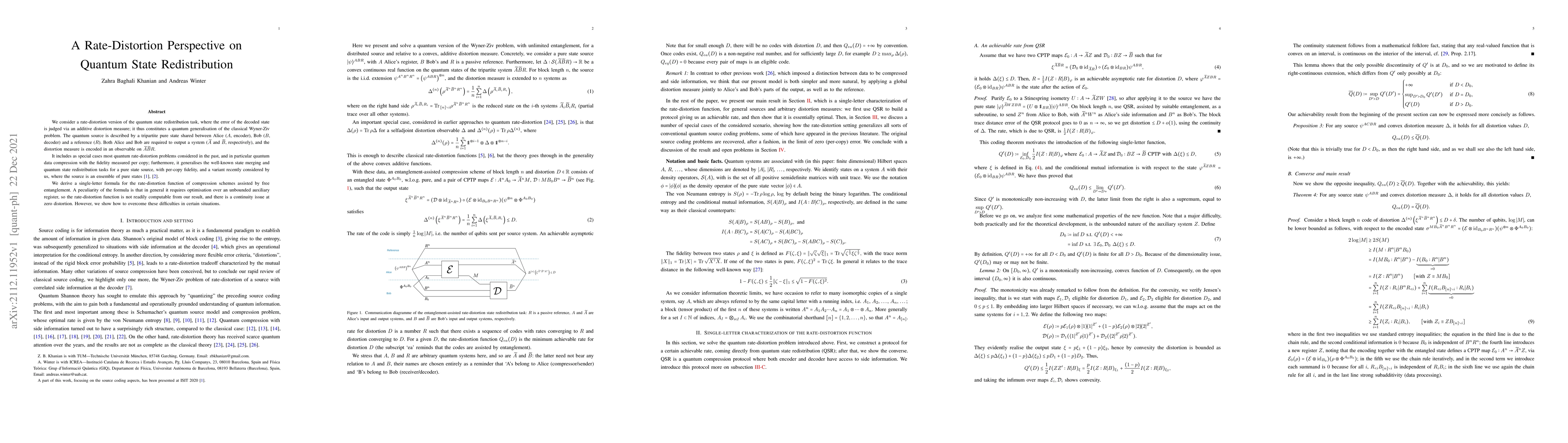 This paper explores a rate-distortion version of quantum state redistribution, generalizing the classical Wyner-Ziv problem to quantum systems. It derives a single-letter formula for the rate-distortion function, though it requires optimization over an unbounded auxiliary register and faces continuity issues at zero distortion.