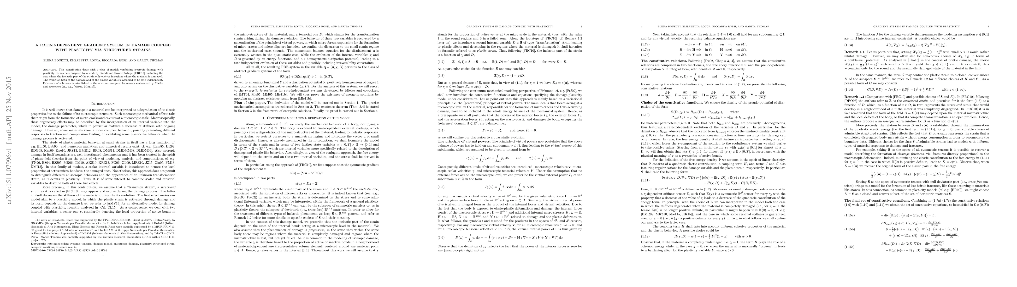 This contribution deals with a class of models combining isotropic damage with plasticity. We are inspired by It has been inspired by a work by Freddi and Royer-Carfagni, including the case where the inelastic part of the strain only evolves in regions where the material is damaged. The evolution both of the damage and of the plastic variable is assumed to be rate-independent. Existence of solutions is established in the abstract energetic framework elaborated by Mielke and coworkers.