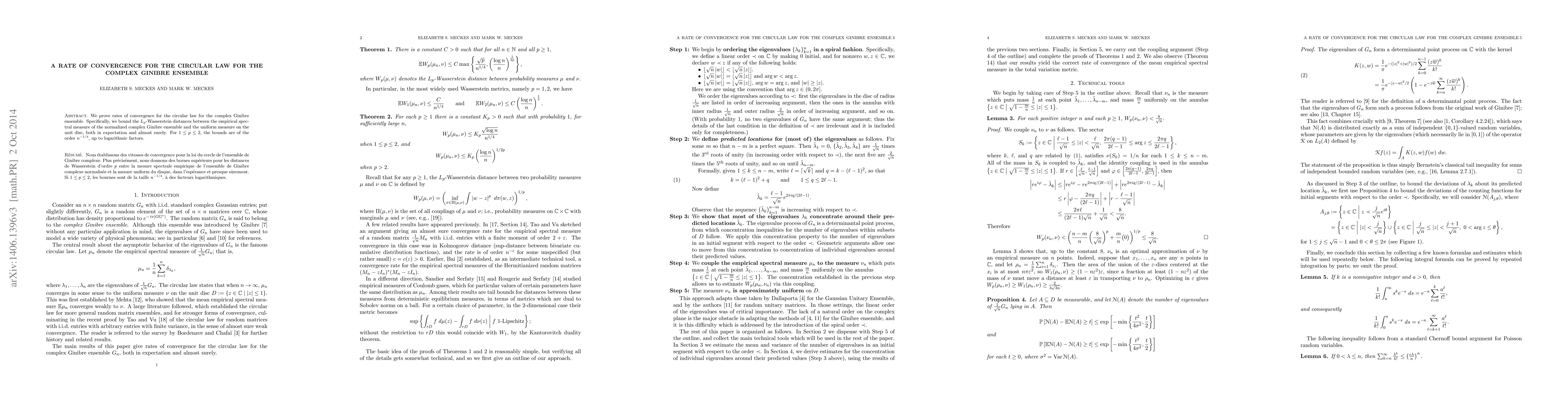 This research proves rates of convergence for the circular law in the complex Ginibre ensemble, showing that the empirical spectral measure converges to the uniform measure on the unit disc with an expected $L_p$-Wasserstein distance bound of $n^{-1/4}$, up to logarithmic factors, for $1 \le p \le 2$.