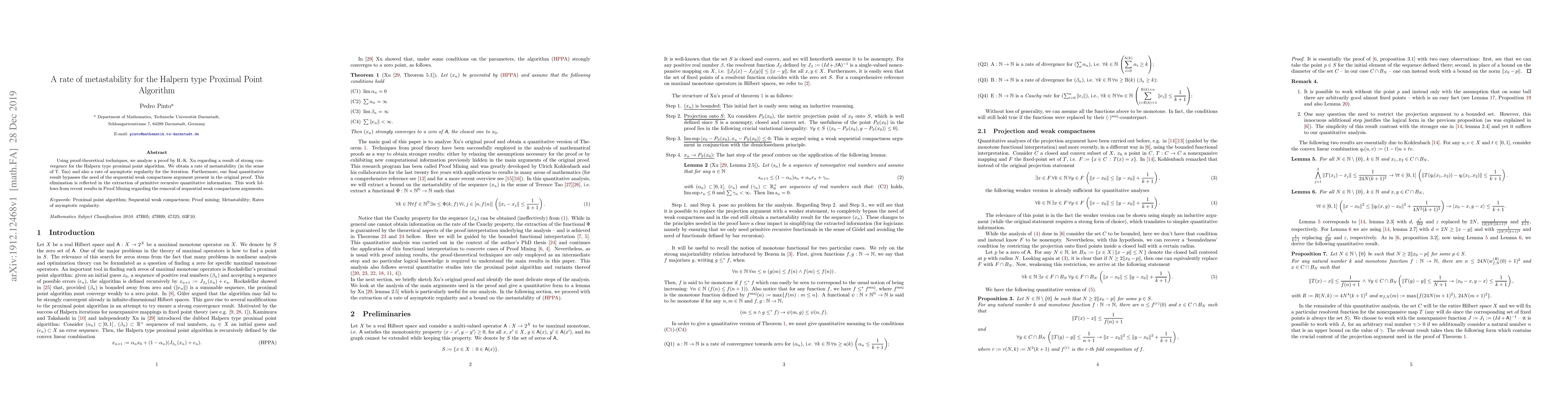 This paper analyzes a proof by H.-K. Xu on the strong convergence of the Halpern type proximal point algorithm, deriving a rate of metastability and asymptotic regularity without relying on sequential weak compactness, thus extracting primitive recursive quantitative information. The work is informed by recent advancements in Proof Mining.