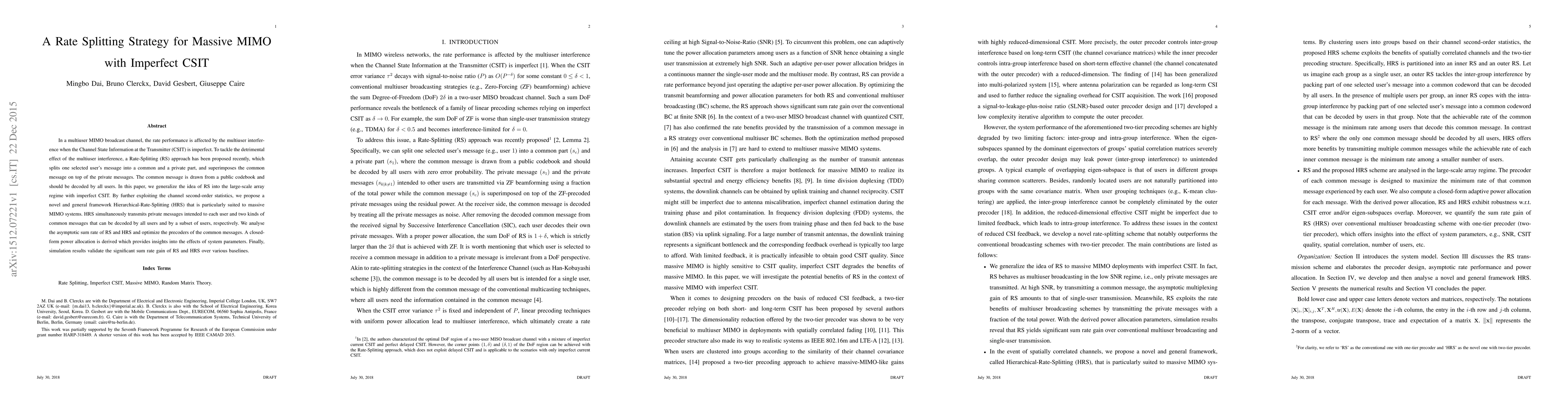 This paper proposes a Hierarchical-Rate-Splitting (HRS) framework for massive MIMO systems with imperfect Channel State Information at the Transmitter (CSIT). It generalizes the Rate-Splitting approach to handle multiuser interference, optimizing precoders and deriving a closed-form power allocation to achieve significant sum rate gains over baselines, as validated by simulations.