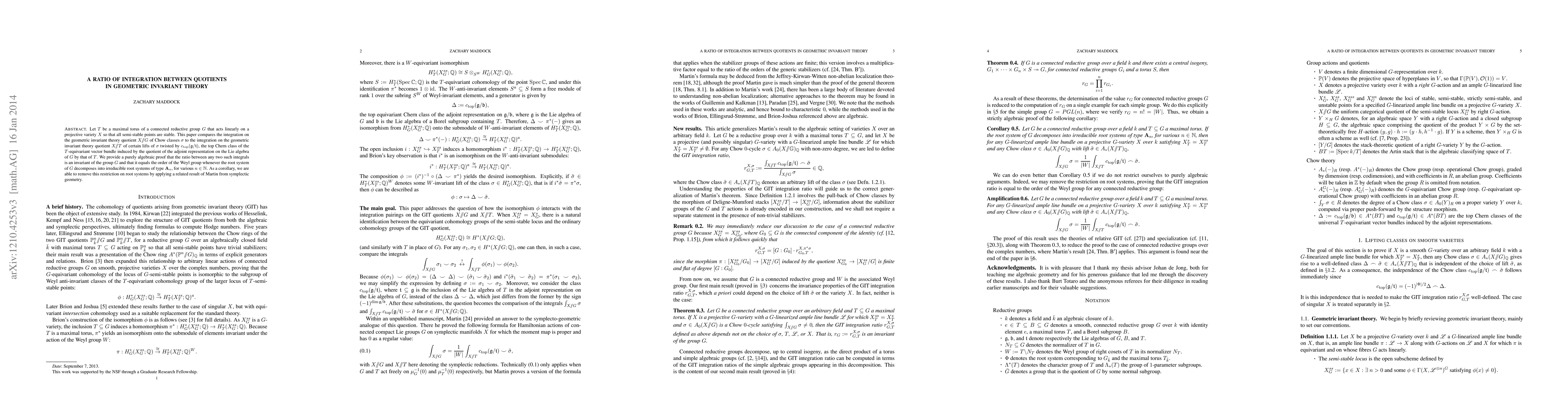 This paper provides a purely algebraic proof for the ratio of integration between quotients in geometric invariant theory, showing it is an invariant of the group G and equals the order of the Weyl group for type $A_n$ root systems. It extends this result beyond specific root systems using a related symplectic geometry result from Martin.