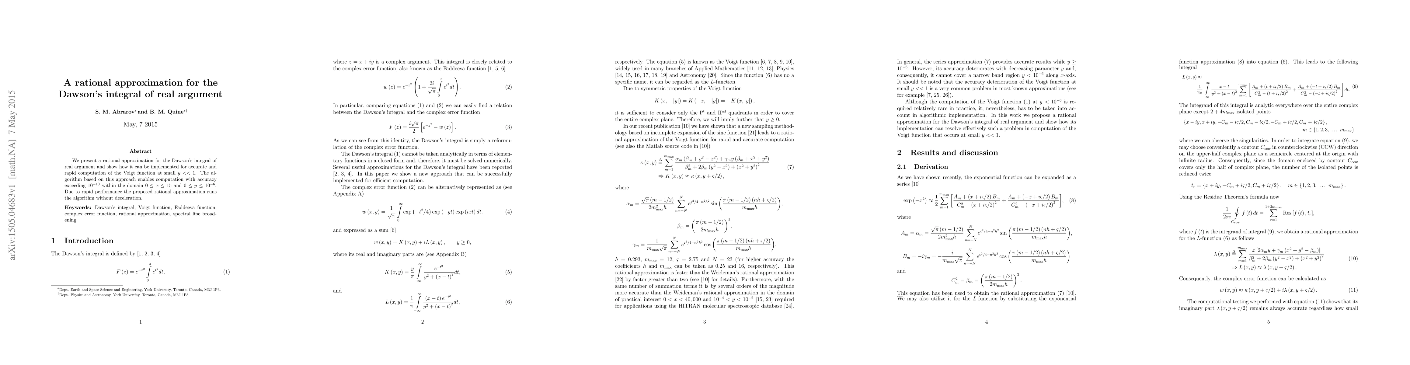 We present a rational approximation for the Dawson's integral of real argument and show how it can be implemented for accurate and rapid computation of the Voigt function at small $y < < 1$. The algorithm based on this approach enables computation with accuracy exceeding ${10^{ - 10}}$ within the domain $0 \le x \le 15$ and $0 \le y \le {10^{ - 6}}$. Due to rapid performance the proposed rational approximation runs the algorithm without deceleration.