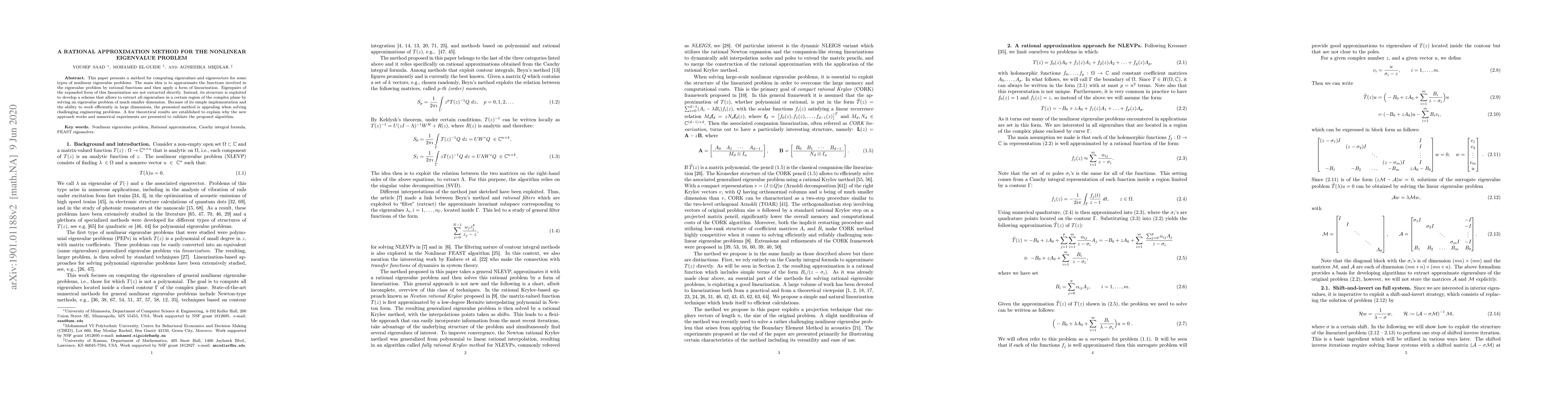 This paper introduces a rational approximation method for solving nonlinear eigenvalue problems by linearizing the problem and exploiting its structure to extract eigenvalues efficiently. The method is validated through theoretical results and numerical experiments, demonstrating its effectiveness for large-dimensional engineering applications.