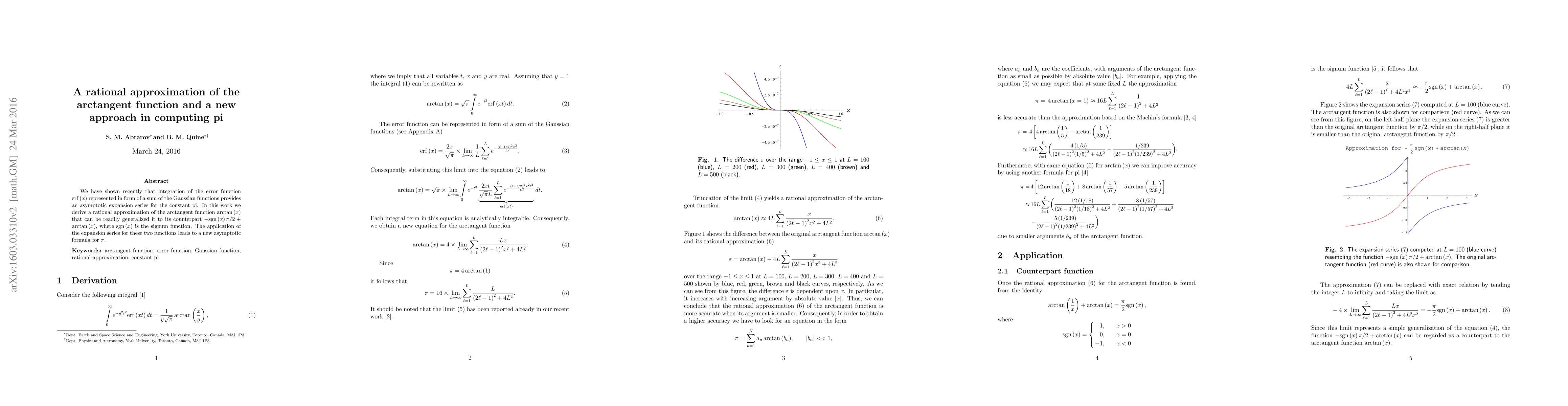This paper presents a rational approximation for the arctangent function and extends it to compute $\pi$ via an asymptotic expansion series derived from the error function integrated as a sum of Gaussian functions. The new approach provides a novel method for calculating the constant $\pi$.