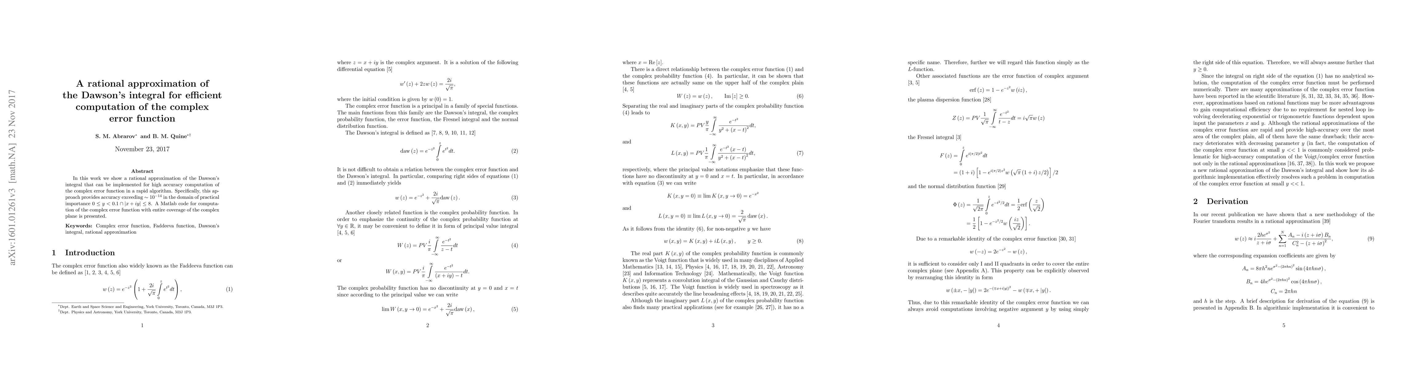 In this work we show a rational approximation of the Dawson's integral that can be implemented for high-accuracy computation of the complex error function in a rapid algorithm. Specifically, this approach provides accuracy exceeding $\sim {10^{ - 14}}$ in the domain of practical importance $0 \le y < 0.1 \cap \left| {x + iy} \right| \le 8$. A Matlab code for computation of the complex error function with entire coverage of the complex plane is presented.