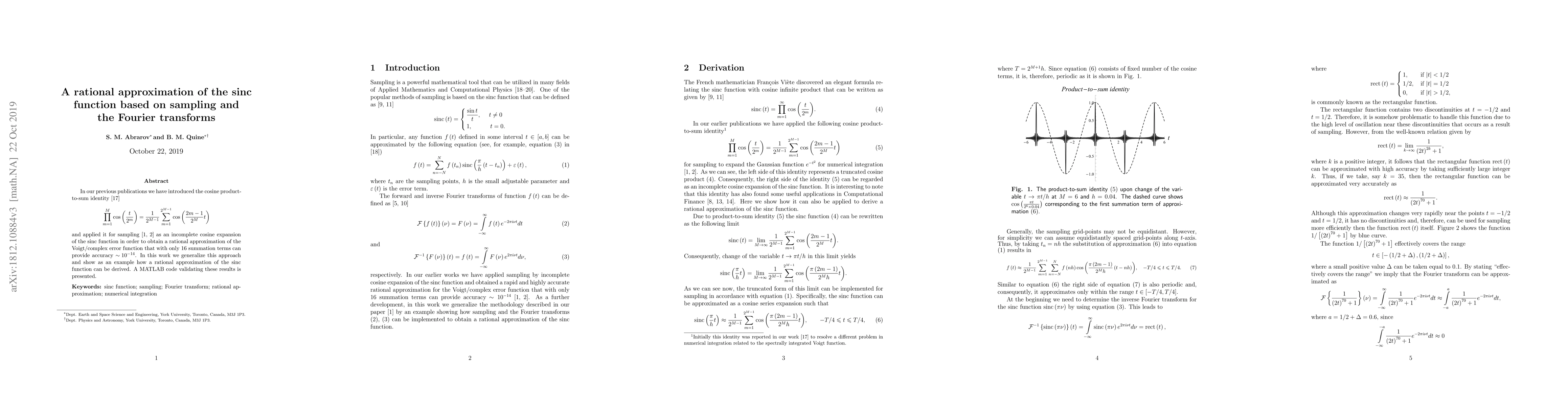 In our previous publications we have introduced the cosine product-to-sum identity [17] $$ \prod\limits_{m = 1}^M {\cos \left( {\frac{t}{{{2^m}}}} \right)} = \frac{1}{{{2^{M - 1}}}}\sum\limits_{m = 1}^{{2^{M - 1}}} {\cos \left( {\frac{{2m - 1}}{{{2^M}}}t} \right)} $$ and applied it for sampling [1, 2] as an incomplete cosine expansion of the sinc function in order to obtain a rational approximation of the Voigt/complex error function that with only $16$ summation terms can provide accuracy ${\sim 10^{ - 14}}$. In this work we generalize this approach and show as an example how a rational approximation of the sinc function can be derived. A MATLAB code validating these results is presented.
