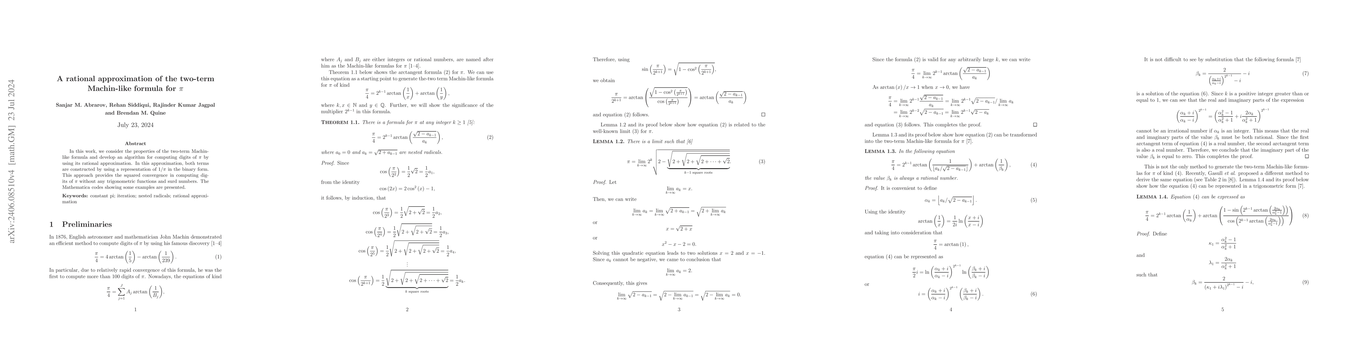 This paper develops a rational approximation for a two-term Machin-like formula to compute digits of $\pi$ with squared convergence speed, utilizing binary representation of $1/\pi$ without trigonometric or surd functions, and includes Mathematica examples.