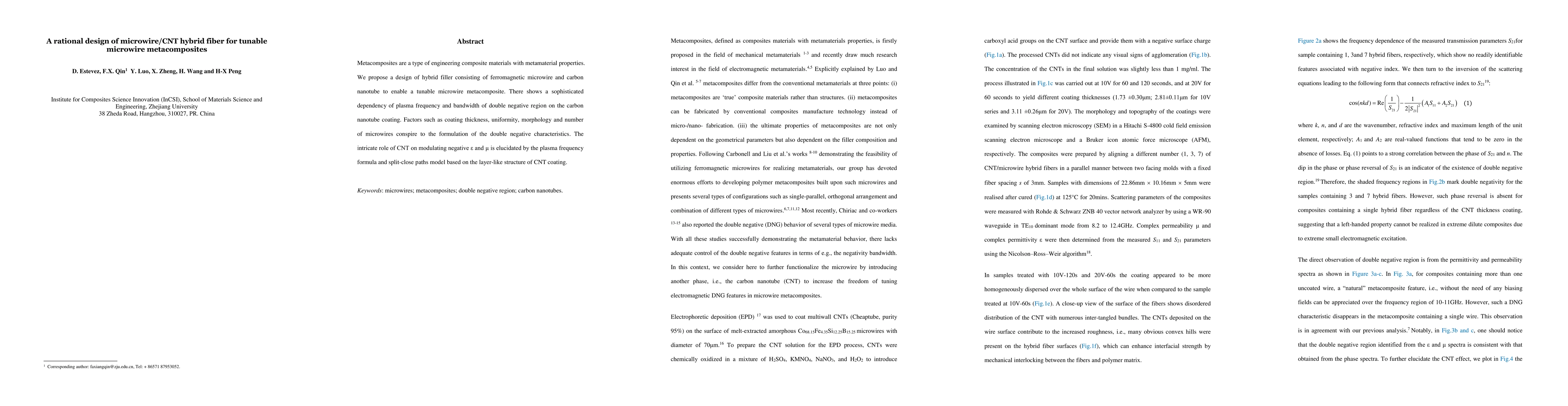 The research presents a design for microwire/CNT hybrid fiber to create tunable microwire metacomposites. Key findings indicate that the plasma frequency and bandwidth of the double negative region depend significantly on carbon nanotube coating. Factors like thickness, uniformity, and number of microwires, along with CNT's modulating role on negative permittivity and permeability, are elucidated using plasma frequency formula and split-close paths model.