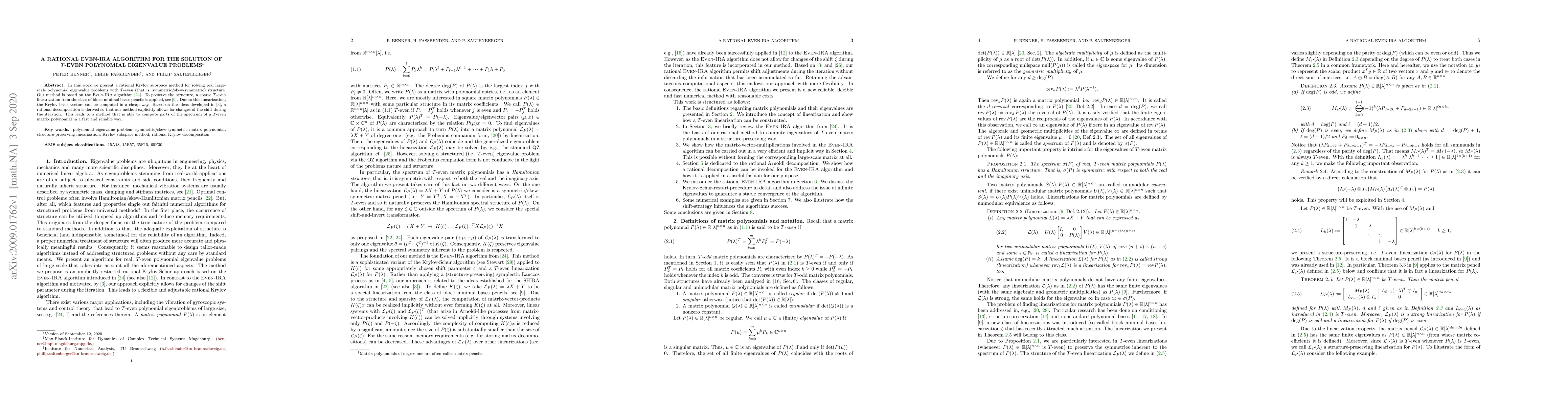 This paper introduces a rational Krylov subspace method based on the Even-IRA algorithm for solving large-scale T-even polynomial eigenvalue problems. It employs a sparse T-even linearization to efficiently compute Krylov basis vectors and allows for shift changes during iteration, enabling fast and reliable computation of parts of the spectrum.