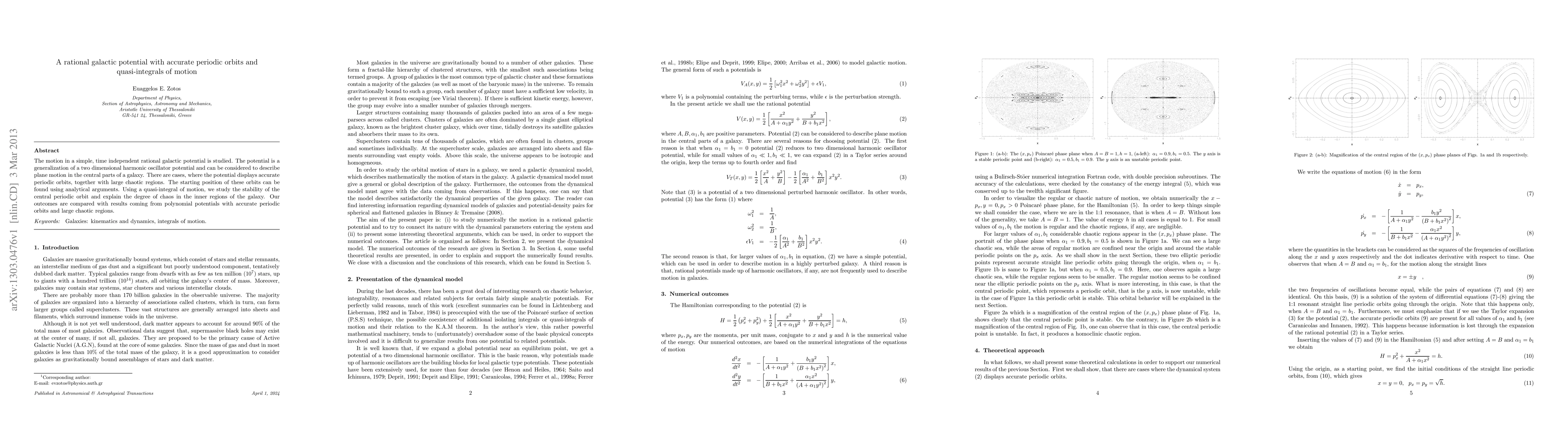The motion in a simple, time independent rational galactic potential is studied. The potential is a generalization of a two dimensional harmonic oscillator potential and can be considered to describe plane motion in the central parts of a galaxy. There are cases, where the potential displays accurate periodic orbits, together with large chaotic regions. The starting position of these orbits can be found using analytical arguments. Using a quasi-integral of motion, we study the stability of the central periodic orbit and explain the degree of chaos in the inner regions of the galaxy. Our outcomes are compared with results coming from polynomial potentials with accurate periodic orbits and large chaotic regions.