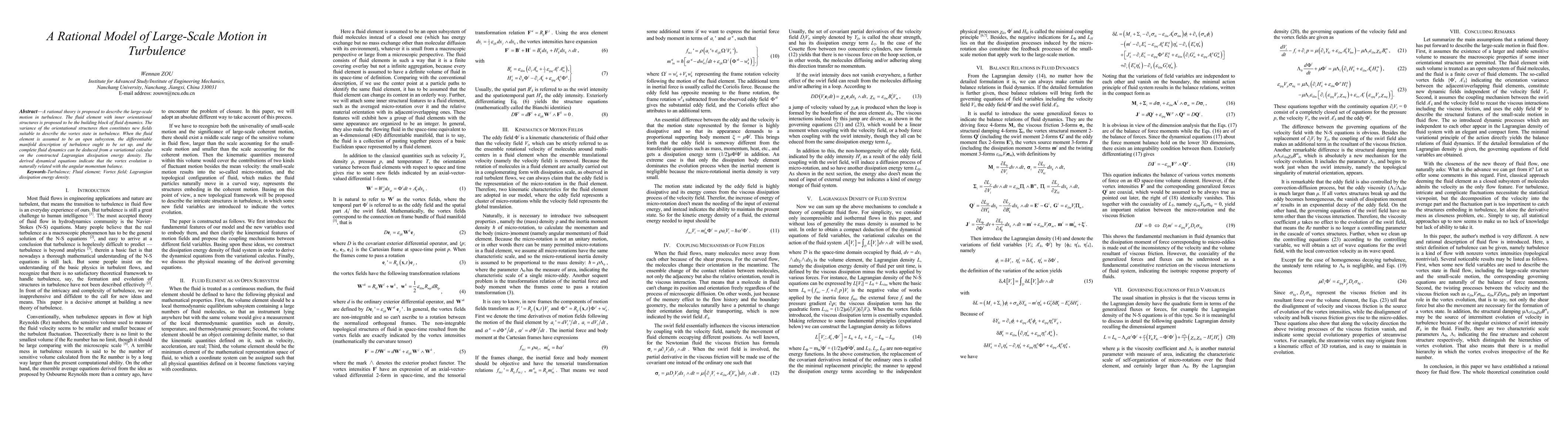 A rational theory is proposed to describe the large-scale motion in turbulence. The fluid element with inner orientational structures is proposed to be the building block of fluid dynamics. The variance of the orientational structures then constitutes new fields suitable to describe the vortex state in turbulence. When the fluid element is assumed to be an open subsystem, the differentiable manifold description of turbulence ought to be set up, and the complete fluid dynamics can be deduced from a variational calculus on the constructed Lagrangian dissipation energy density. The derived dynamical equations indicate that the vortex evolution is naturally related with the angular momentum balance.