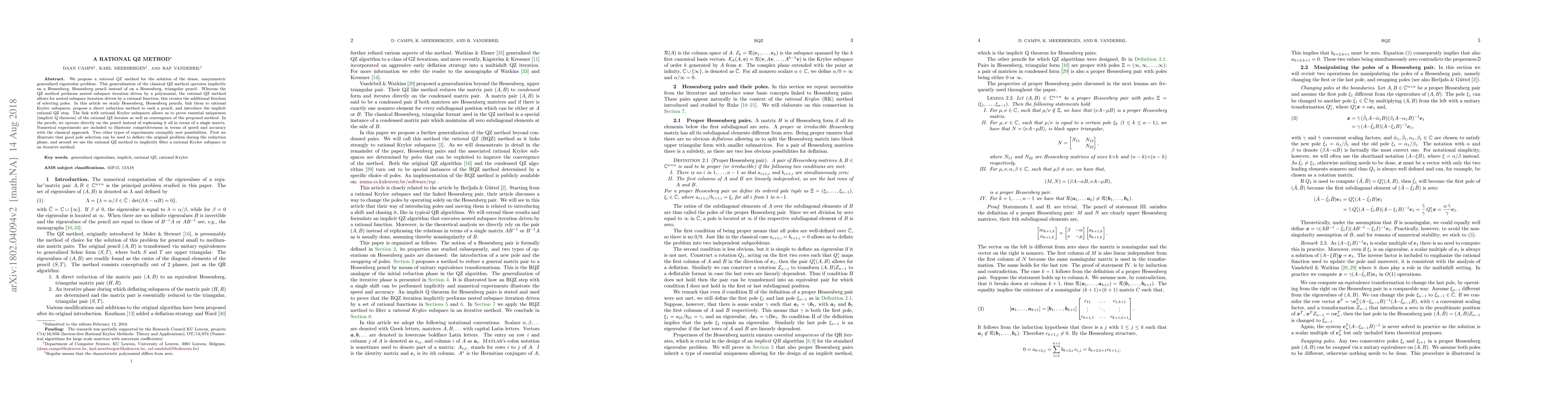 We propose a rational QZ method for the solution of the dense, unsymmetric generalized eigenvalue problem. This generalization of the classical QZ method operates implicitly on a Hessenberg, Hessenberg pencil instead of on a Hessenberg, triangular pencil. Whereas the QZ method performs nested subspace iteration driven by a polynomial, the rational QZ method allows for nested subspace iteration driven by a rational function, this creates the additional freedom of selecting poles. In this article we study Hessenberg, Hessenberg pencils, link them to rational Krylov subspaces, propose a direct reduction method to such a pencil, and introduce the implicit rational QZ step. The link with rational Krylov subspaces allows us to prove essential uniqueness (implicit Q theorem) of the rational QZ iterates as well as convergence of the proposed method. In the proofs, we operate directly on the pencil instead of rephrasing it all in terms of a single matrix. Numerical experiments are included to illustrate competitiveness in terms of speed and accuracy with the classical approach. Two other types of experiments exemplify new possibilities. First we illustrate that good pole selection can be used to deflate the original problem during the reduction phase, and second we use the rational QZ method to implicitly filter a rational Krylov subspace in an iterative method.