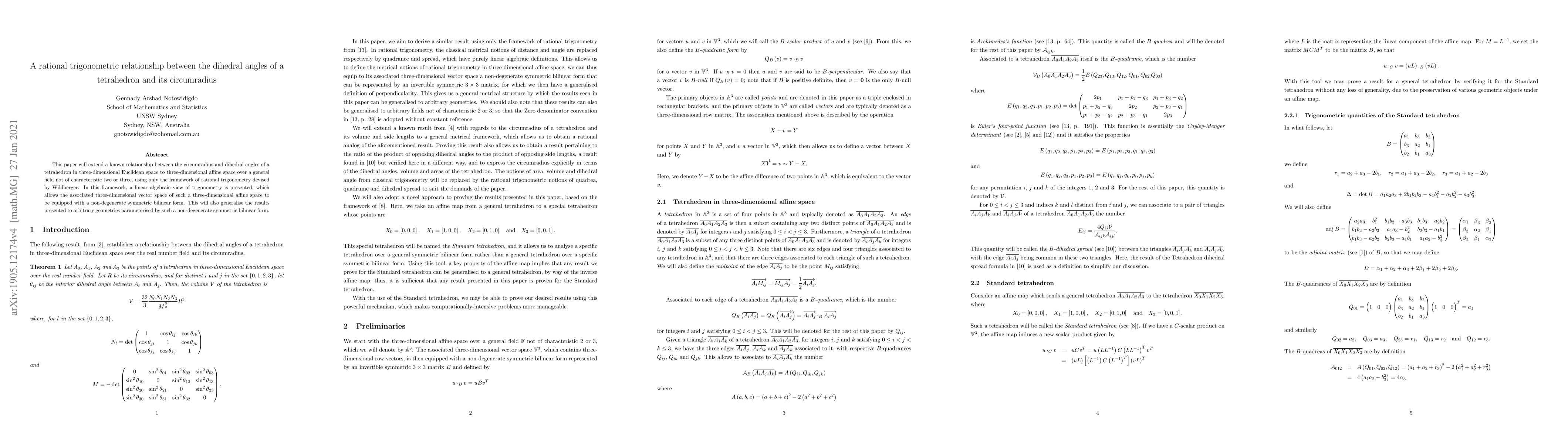 This paper will extend a known relationship between the circumradius and dihedral angles of a tetrahedron in three-dimensional Euclidean space to three-dimensional affine space over a general field not of characteristic two, using only the framework of rational trigonometry devised by Wildberger. In this framework, a linear algebraic view of trigonometry is presented, which allows the associated three-dimensional vector space of such a three-dimensional affine space to be equipped with a non-degenerate symmetric bilinear form; this will also generalise the results presented to arbitrary geometries parameterised by such a non-degenerate symmetric bilinear form.