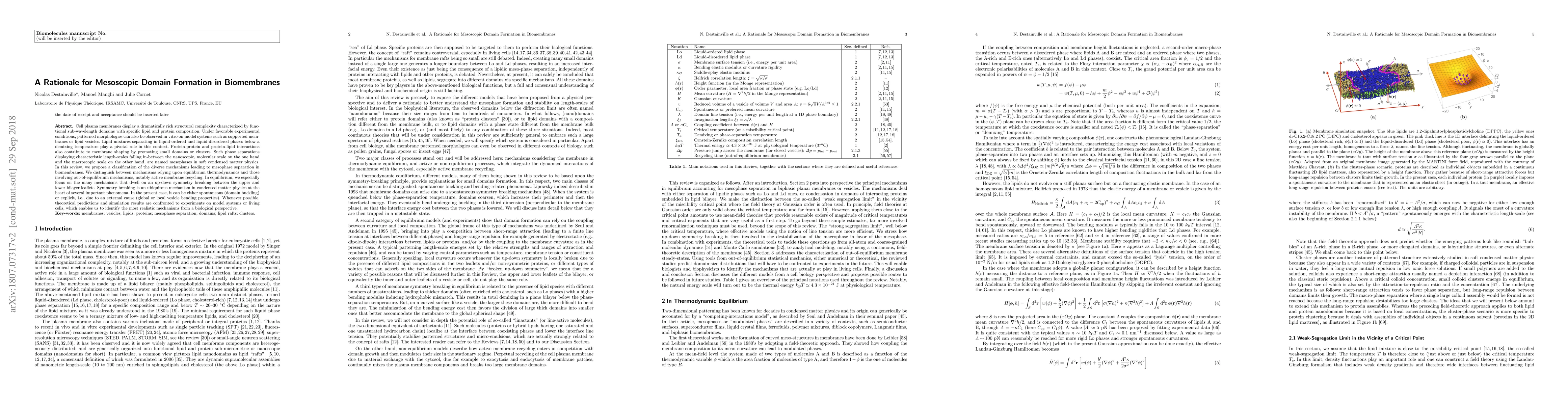 Cell plasma membranes display a dramatically rich structural complexity characterized by functional sub-wavelength domains with specific lipid and protein composition. Under favorable experimental conditions, patterned morphologies can also be observed in vitro on model systems such as supported membranes or lipid vesicles. Lipid mixtures separating in liquid-ordered and liquid-disordered phases below a demixing temperature play a pivotal role in this context. Protein-protein and protein-lipid interactions also contribute to membrane shaping by promoting small domains or clusters. Such phase separations displaying characteristic length-scales falling in-between the nanoscopic, molecular scale on the one hand and the macroscopic scale on the other hand, are named mesophases in soft condensed matter physics. In this review, we propose a classification of the diverse mechanisms leading to mesophase separation in biomembranes. We distinguish between mechanisms relying upon equilibrium thermodynamics and those involving out-of-equilibrium mechanisms, notably active membrane recycling. In equilibrium, we especially focus on the many mechanisms that dwell on an up-down symmetry breaking between the upper and lower bilayer leaflets. Symmetry breaking is an ubiquitous mechanism in condensed matter physics at the heart of several important phenomena. In the present case, it can be either spontaneous (domain buckling) or explicit, i.e., due to an external cause (global or local vesicle bending properties). Whenever possible, theoretical predictions and simulation results are confronted to experiments on model systems or living cells, which enables us to identify the most realistic mechanisms from a biological perspective.