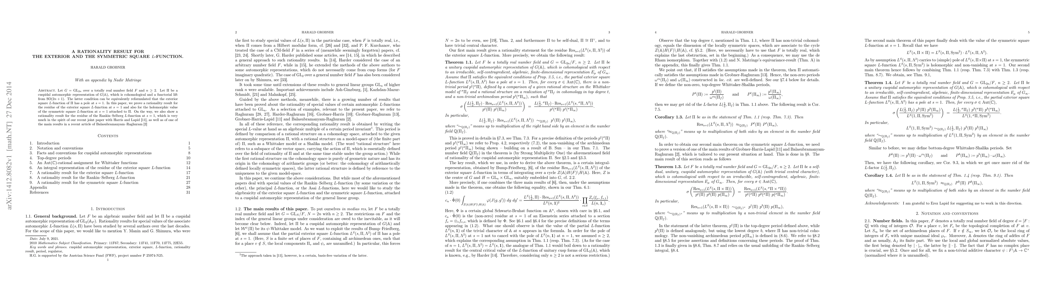 This paper proves rationality results for the residue of the exterior square $L$-function and the holomorphic value of the symmetric square $L$-function at $s=1$ for a cuspidal automorphic representation $\Pi$ of ${\rm GL}_{2n}$ over a totally real number field. The work also extends to a rationality result for the Rankin-Selberg $L$-function residue at $s=1$.