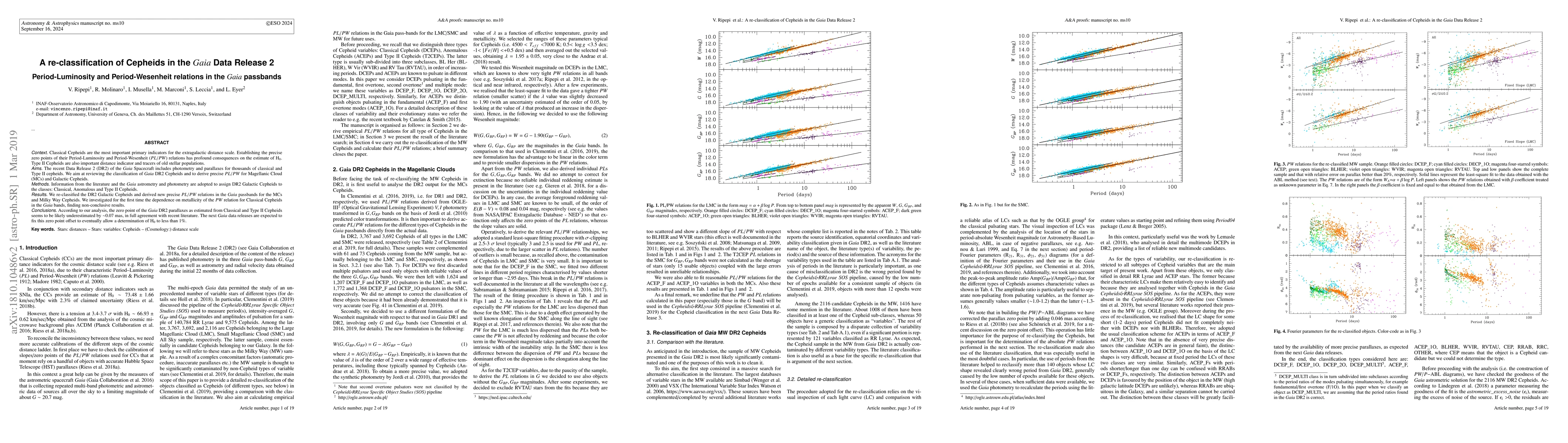 The paper presents a detailed re-classification of Cepheids from Gaia DR2 and derivation of new PL/PW relations, utilizing Gaia astrometry and photometry along with literature data.