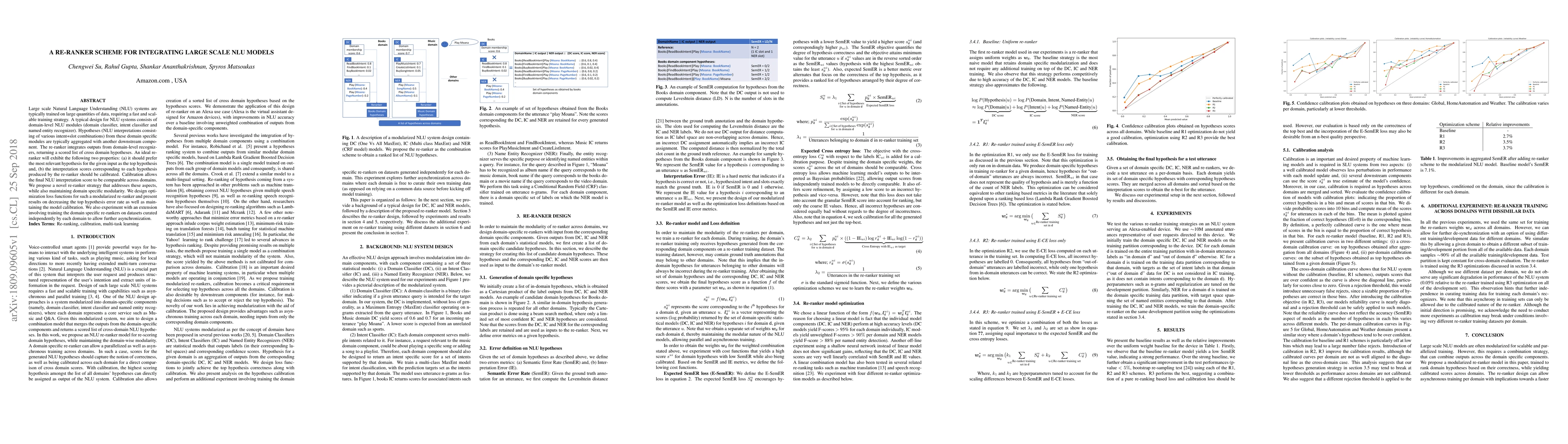This research introduces a novel re-ranker strategy for integrating large scale NLU models, improving top hypothesis accuracy and ensuring cross-domain calibration. The method maintains domain-specific modularity and demonstrates enhanced NLU performance compared to unweighted aggregation.