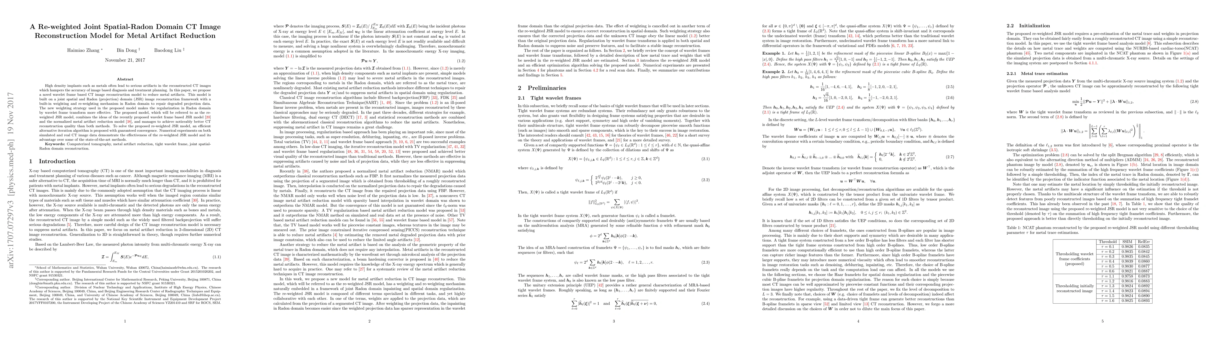 This paper proposes a novel CT image reconstruction model that reduces metal artifacts using a wavelet frame-based joint spatial-Radon domain framework with a re-weighting mechanism. The re-weighted JSR model improves reconstruction quality and outperforms existing methods, as demonstrated by numerical experiments on both simulated and real data.